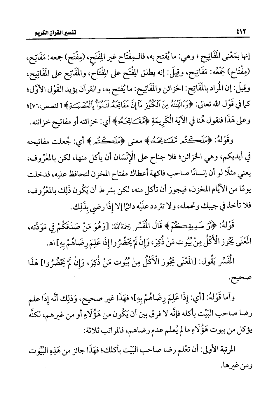وقَوْلهُ: {أَوْ مَا مَلَكْتُمْ مَفَاتِحَهُ} معنى {مَلَكْتُمْ} أي: جُعلت مفاتيحه في أيديكم، وهي الخزائن، فلا جناح على الْإِنْسَان أن يأكل منها، لكن بالمعْرُوف، يعني مثلًا لو أن إنسانًا صاحب فاكهة أعطاك مفتاح المخزن لتحافظ عليه، فدخلت يومًا من الأيَّام المخزن، فيجوز أن تأكل منه، لكن بشرط أن يَكُون ذَلِك بالمعْرُوف، فلا تأخذ في جيبك وتحمله، ولا تتردد علَيْه دائمًا إلَّا إِذَا رضي بِذَلِك.
