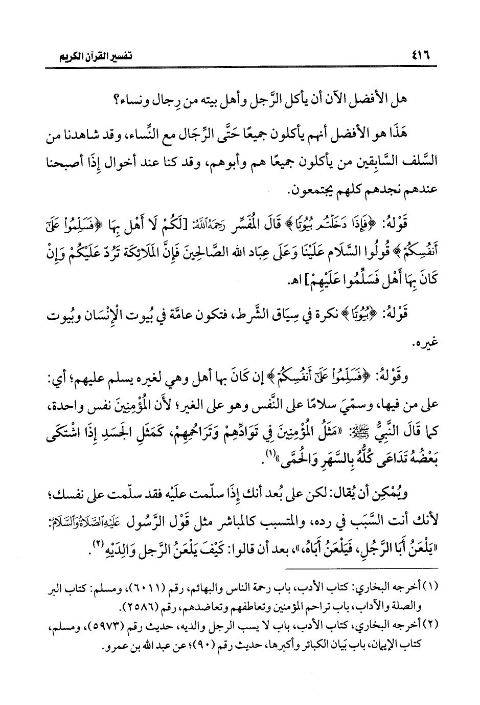 وقَوْلهُ: {فَسَلِّمُوا عَلَى أَنْفُسِكُمْ} إن كَانَ بها أهل وهي لغيره يسلم عليهم؛ أي: على من فيها، وسمّيَ سلامًا على النَّفس وهو على الغير؛ لأَن المُؤْمِنِينَ نفس واحدة، كما قَالَ النَّبِيُّ - صلى الله عليه وسلم -: "مَثَلُ المُؤْمِنِينَ فِي تَوَادِّهِمْ وَتَرَاحُمِهِمْ، كَمَثَلِ الجَسَدِ إِذَا اشْتكَى بَعْضُهُ تَدَاعَى كُلُّهُ بِالسَّهَرِ وَالحُمَّى" (¬١).