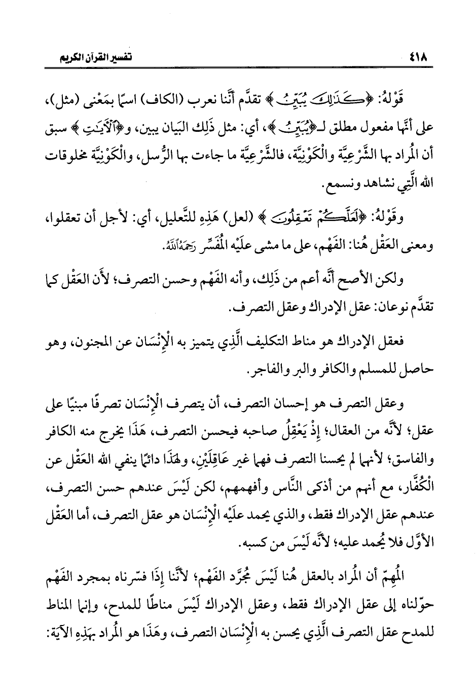المُهِمّ أن المُراد بالعقل هُنا لَيْسَ مُجرَّد الفَهْم؛ لأَنَّنا إِذَا فسّرناه بمجرد الفَهْم حوّلناه إلى عقل الإدراك فقط، وعقل الإدراك لَيْسَ مناطًا للمدح، وإنَّما المناط للمدح عقل التصرف الَّذِي يحسن به الْإِنْسَان التصرف، وهَذَا هو المُراد بهَذِهِ الآية: