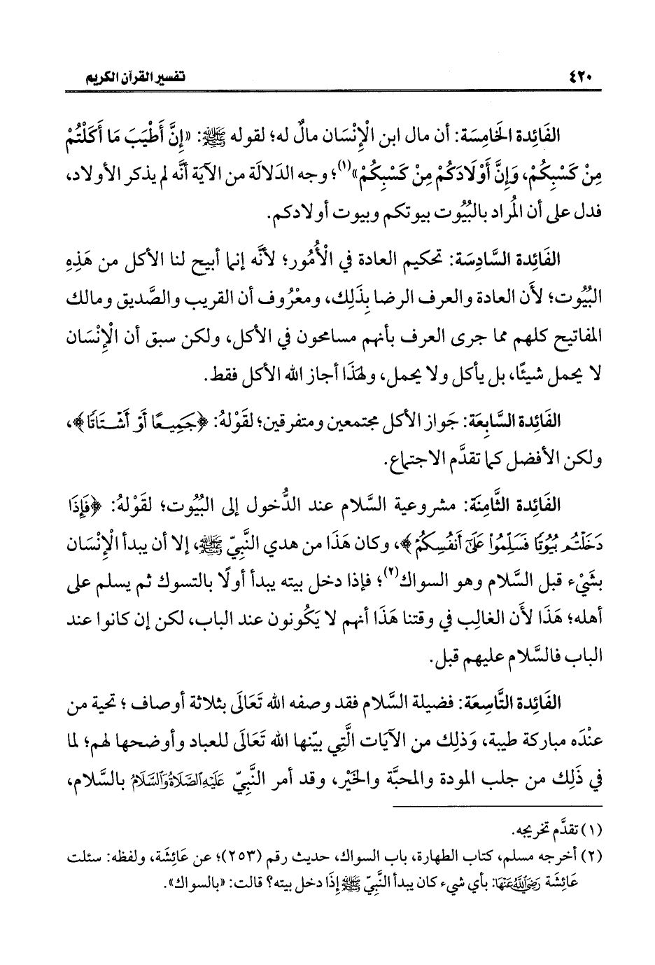 الفَائِدة الثَّامِنة: مشروعية السَّلام عند الدُّخول إلى البُيُوت، لقَوْلهُ: {فَإِذَا دَخَلْتُمْ بُيُوتًا فَسَلِّمُوا عَلَى أَنْفُسِكُمْ}، وكان هَذَا من هدي النَّبِيّ - صلى الله عليه وسلم -، إلَّا أن يبدأ الْإِنْسَان بشَيْء قبل السَّلام وهو السواك (¬٢)؛ فإذا دخل بيته يبدأ أولًا بالتسوك ثم يسلم على أهله؛ هَذَا لأَن الغالِب في وقتنا هَذَا أنهم لا يَكُونون عند الباب، لكن إن كانوا عند الباب فالسَّلام عليهم قبل.