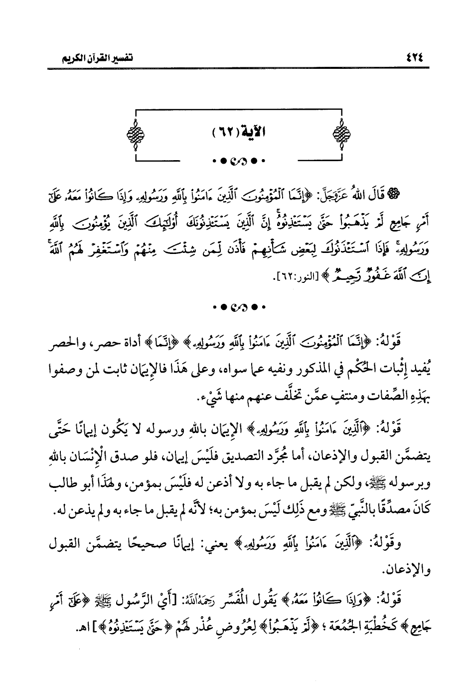 قَوْلهُ: {الَّذِينَ آمَنُوا بِاللَّهِ وَرَسُولِهِ} الإِيمَان باللهِ ورسوله لا يَكُون إيمانًا حَتَّى يتضمَّن القبول والإذعان، أما مُجرَّد التصديق فلَيْسَ إيمان، فلو صدق الْإِنْسَان باللهِ وبرسوله - صلى الله عليه وسلم -، ولكن لم يقبل ما جاء به ولا أذعن له فلَيْسَ بمؤمن، ولِهَذَا أَبو طالب كَانَ مصدِّقًا بالنَّبيّ - صلى الله عليه وسلم - مع ذَلِك لَيْسَ بمؤمن به؛ لأنه لم يقبل ما جاء به ولم يذعن له.