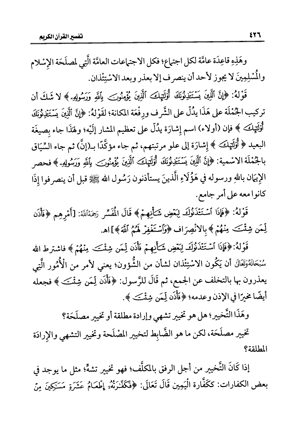 قَوْلهُ: {فَإِذَا اسْتَأْذَنُوكَ لِبَعْضِ شَأْنِهِمْ فَأْذَنْ لِمَنْ شِئْتَ مِنْهُمْ} فاشترط الله سُبْحَانَهُ وَتَعَالَى أن يَكُون الاسْتِئْذان لشأن من الشُّؤون؛ يعني لأمر من الْأُمُور الَّتِي يعذرون بها بالتخلف عن الجمع، ثم قَالَ للرَّسول: {فَأْذَنْ لِمَنْ شِئْتَ} فجعله أيضًا مخيرًا في الإذن وعدمه؛ {فَأْذَنْ لِمَنْ شِئْتَ}.