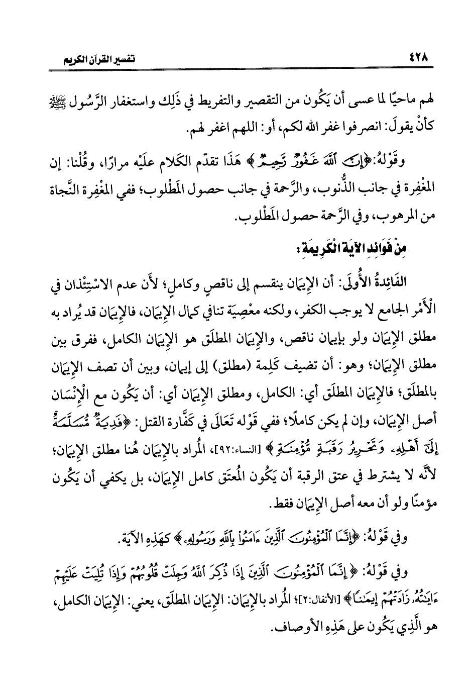 وفي قَوْلهُ: {إِنَّمَا الْمُؤْمِنُونَ الَّذِينَ إِذَا ذُكِرَ اللَّهُ وَجِلَتْ قُلُوبُهُمْ وَإِذَا تُلِيَتْ عَلَيْهِمْ آيَاتُهُ زَادَتْهُمْ إِيمَانًا} [الأنفال: ٢]؛ المُراد بالإِيمَان: الإِيمَان المطلَق، يعني: الإِيمَان الكامل، هو الَّذِي يَكُون على هَذِهِ الأوصاف.