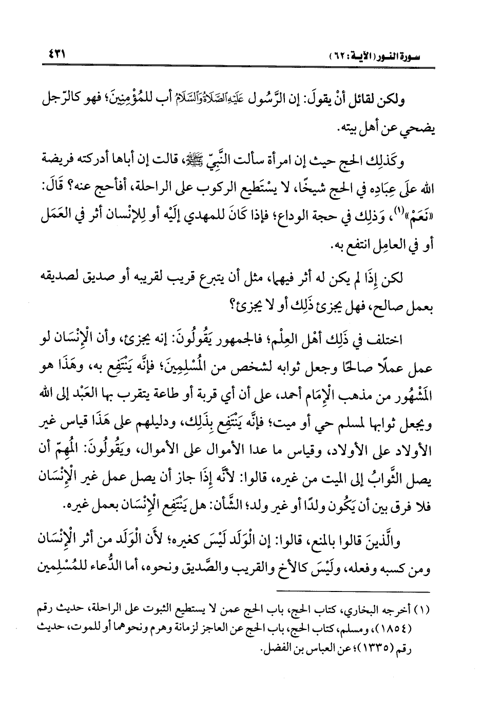 (¬١) أخرجه البخاري، كتاب الحج، باب الحج عمن لا يستطيع الثبوت على الراحلة، حديث رقم (١٨٥٤)، ومسلم، كتاب الحج، باب الحج عن العاجز لزمانة وهرم ونحوهما أو للموت، حديث رقم (١٣٣٥)؛ عن العباس بن الفضل.