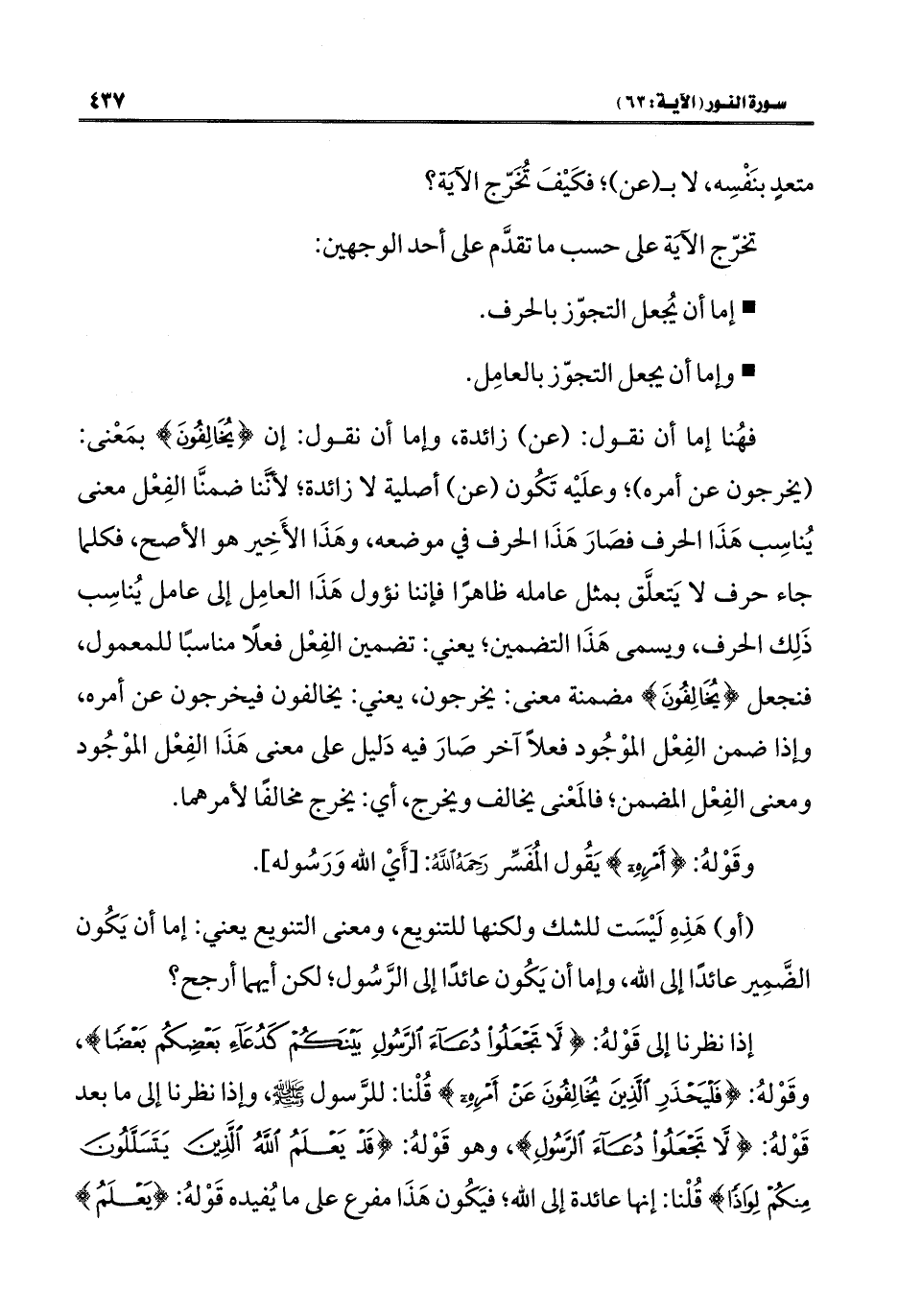إذا نظرنا إلى قَوْله: {لَا تَجْعَلُوا دُعَاءَ الرَّسُولِ بَيْنَكُمْ كَدُعَاءِ بَعْضِكُمْ بَعْضًا}، وقَوْلهُ: {فَلْيَحْذَرِ الَّذِينَ يُخَالِفُونَ عَنْ أَمْرِهِ} قُلْنا: للرَّسول - صلى الله عليه وسلم -، وإذا نظرنا إلى ما بعد قَوْلهُ: {لَا تَجْعَلُوا دُعَاءَ الرَّسُولِ}، وهو قَوْلهُ: {قَدْ يَعْلَمُ اللَّهُ الَّذِينَ يَتَسَلَّلُونَ مِنْكُمْ لِوَاذًا} قُلْنا: إنها عائدة إلى الله؛ فيَكُون هَذَا مفرع على ما يُفيده قَوْلهُ: {يَعْلَمُ}