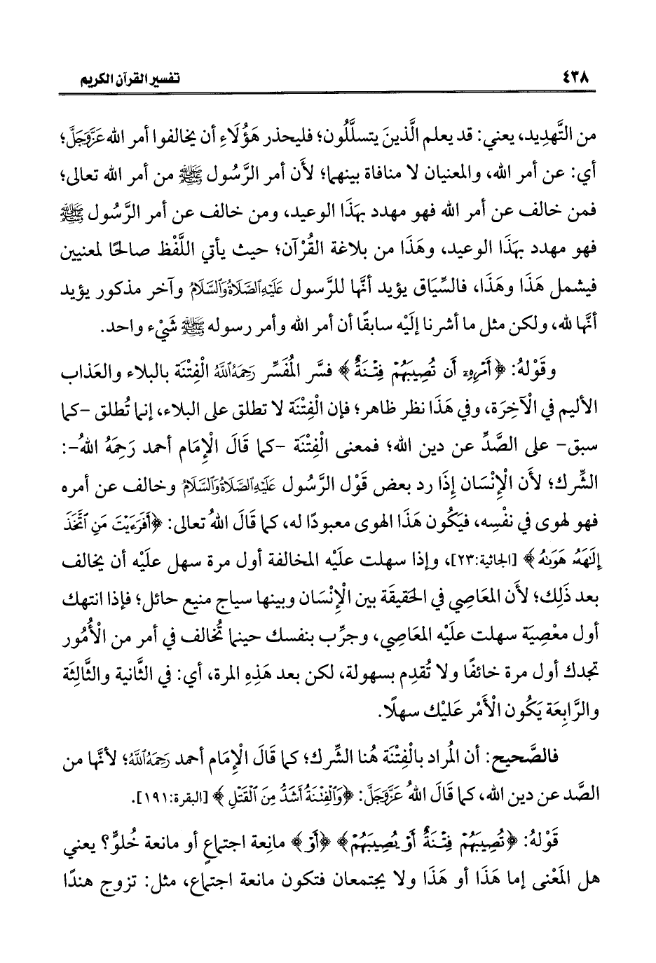 وقَوْلهُ: {أَمْرِهِ أَنْ تُصِيبَهُمْ فِتْنَةٌ} فسَّر المُفَسِّر رَحَمَهُ اللَّهُ الْفِتْنَة بالبلاء والعَذاب الأليم في الْآخِرَة، وفي هَذَا نظر ظاهر، فإن الْفِتْنَة لا تطلق على البلاء، إنما تُطلق - كما سبق - على الصَّدِّ عن دين الله، فمعنى الْفِتْنَة - كما قَالَ الْإِمَام أحمد رَحِمَهُ اللهُ -: الشِّرك؛ لأَن الْإِنْسَان إِذَا رد بعض قَوْل الرَّسُول عَلَيهِ الصَّلَاةُ وَالسَّلَامُ وخالف عن أمره فهو لهوى في نفْسِه، فيَكُون هَذَا الهوى معبودًا له، كما قَالَ اللهُ تعالى: {أَفَرَأَيْتَ مَنِ اتَّخَذَ إِلَهَهُ هَوَاهُ} [الجاثية: ٢٣]، وإذا سهلت علَيْه المخالفة أول مرة سهل علَيْه أن يخالف بعد ذَلِك، لأَنَّ المعَاصِي في الحقيقَة بين الْإِنْسَان وبينها سياج منيع حائل، فإذا انتهك أول معْصِيَة سهلت علَيْه المعَاصِي، وجرِّب بنفسك حينما تُخالف في أمر من الْأُمُور تجدك أول مرة خائفًا ولا تُقدِم بسهولة، لكن بعد هَذِهِ المرة، أي: في الثَّانية والثَّالِثَة والرَّابِعَة يَكُون الْأَمْر عَليْك سهلًا.