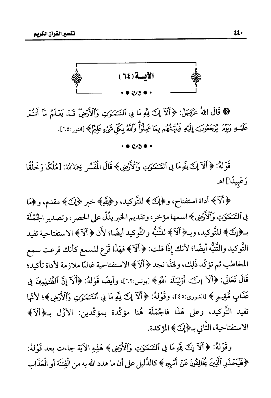 * قَالَ اللهُ عَزَّ وَجلَّ: {أَلَا إِنَّ لِلَّهِ مَا فِي السَّمَاوَاتِ وَالْأَرْضِ قَدْ يَعْلَمُ مَا أَنْتُمْ عَلَيْهِ وَيَوْمَ يُرْجَعُونَ إِلَيْهِ فَيُنَبِّئُهُمْ بِمَا عَمِلُوا وَاللَّهُ بِكُلِّ شَيْءٍ عَلِيمٌ} [النور: ٦٤]