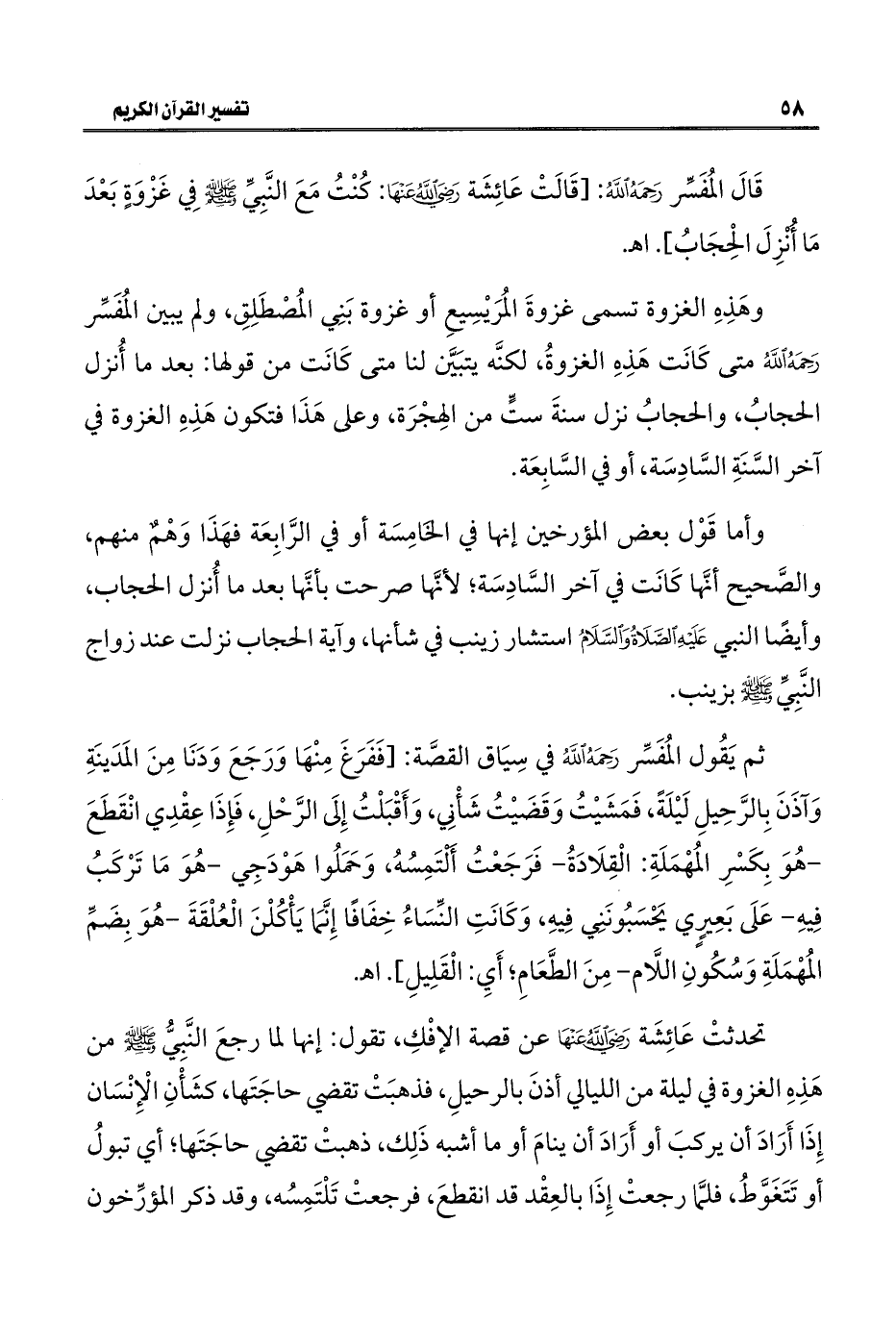 قَالَ المُفَسِّر -رَحِمَهُ اللهُ-: [قَالَتْ عَائِشَة - رضي الله عنها -: كُنْتُ مَعَ النَّبِيِّ - صلى الله عليه وسلم - فِي غَزْوَةٍ بَعْدَ مَا أُنزِل الحِجَابُ". اهـ.