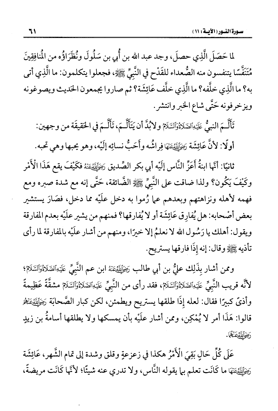 ثانيًا: أنَّها ابنةُ أَعَزِّ النَّاس إلَيْه أبي بكر الصِّديق - رضي الله عنه - فكَيْفَ يقع هَذَا الْأَمْر وكَيْفَ يَكُون؟ ولذا ضاقت على النَّبِيِّ -صَلَّى الله عليه وسلم- الضَّائقة، حَتَّى إنَّه مع شدة صبره ومع فهمه لأهله ونزاهتهم وبعدهم عما رُموا به دخل علَيْه مما دخل، فصَارَ يستشير بعض أصْحابه: هل يُفارِق عَائِشَة أو لا يُفارقها؟ فمنهم من يشير علَيْه بعدم المفارقة ويقول: أهلك يا رَسُول الله لا نعلمُ إلَّا خيرًا، ومنهم من أشار علَيْه بالمفارقة لما رأى تأذيه - صلى الله عليه وسلم - وقال: إنَّه إِذَا فارقها يستريح.