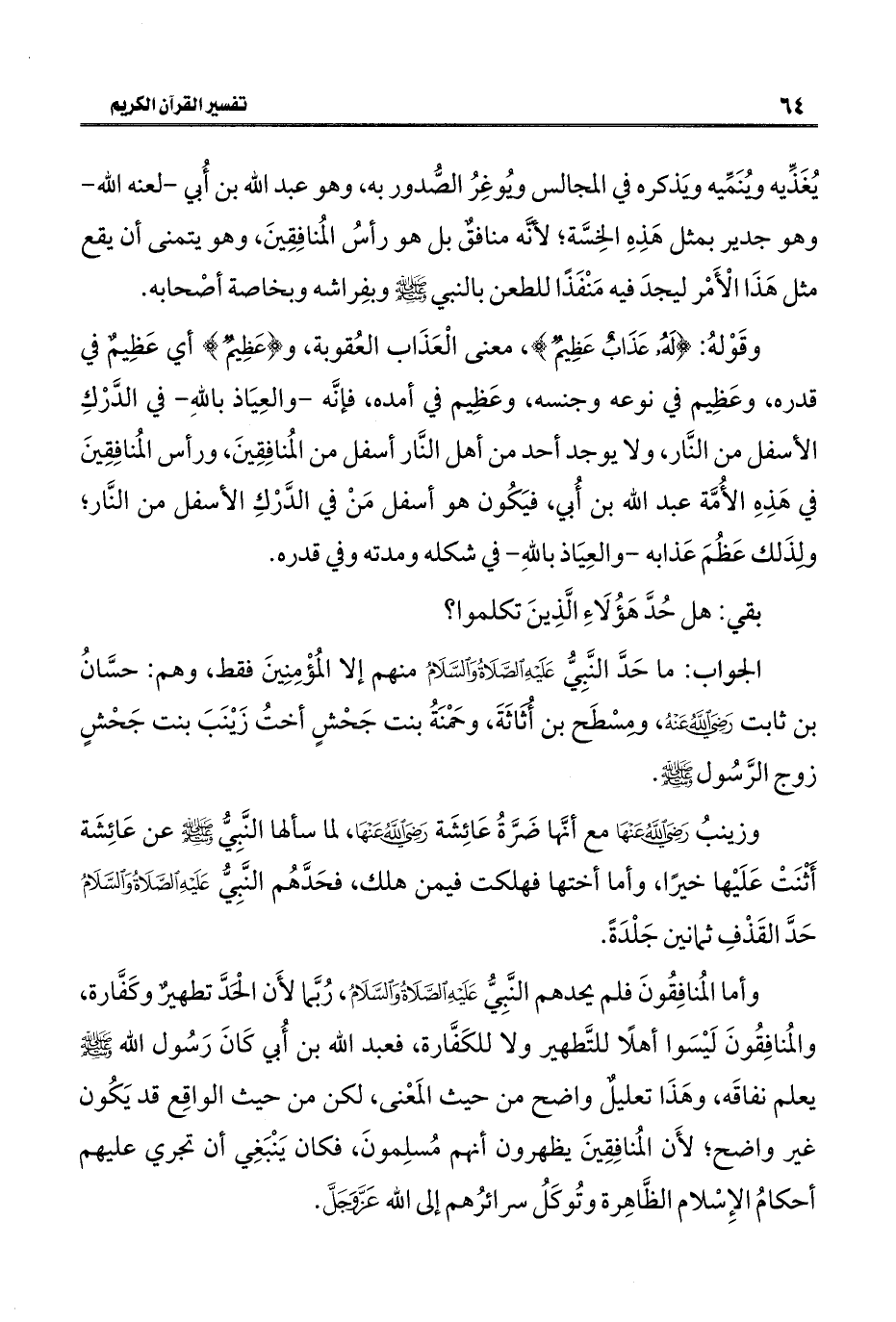 وقَوْلهُ: {لَهُ عَذَابٌ عَظِيمٌ}، معنى الْعَذَاب العُقوبة، و {عَظِيمٌ} أي عَظِيمٌ في قدره، وعَظِيم في نوعه وجنسه، وعَظِيم في أمده، فإنَّه -والعِيَاذ باللهِ- في الدَّرْكِ الأسفل من النَّار، ولا يوجد أحد من أهل النَّار أسفل من المُنافِقِينَ، ورأس المُنافِقِينَ في هَذِهِ الأُمَّة عبد الله بن أُبي، فيَكُون هو أسفل مَنْ في الدَّرْكِ الأسفل من النَّار؛ ولذَلك عَظُمَ عَذابه -والعِيَاذ باللهِ- في شكله ومدته وفي قدره.