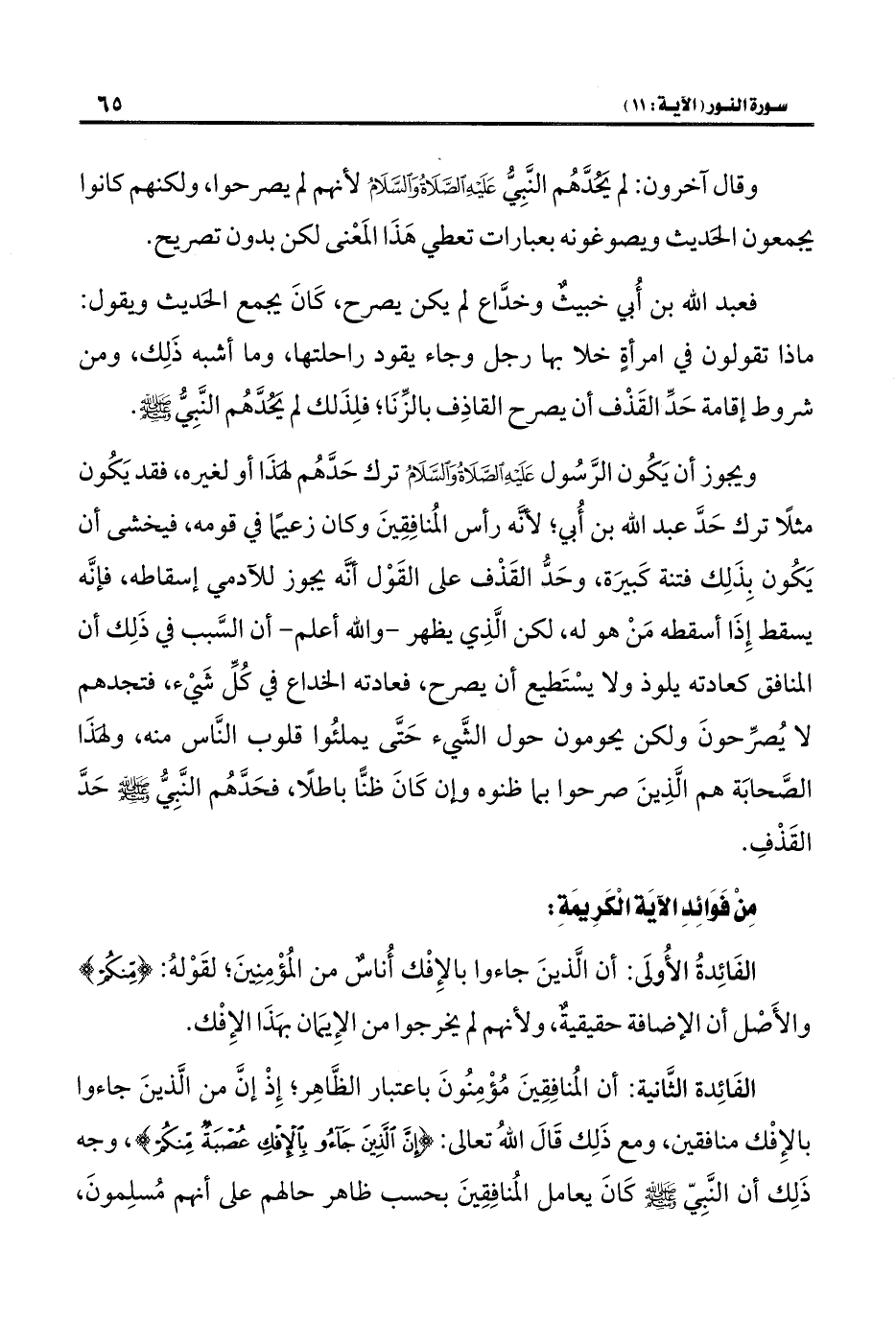 ويجوز أن يَكُون الرَّسُول -عَلَيْهِ الصَّلَاةُ وَالسَّلَامُ- ترك حَدَّهُم لهَذَا أو لغيره، فقد يَكُون مثلًا ترك حَدَّ عبد الله بن أُبي؛ لأَنَّه رأس المُنافِقِينَ وكان زعيمًا في قومه، فيخشى أن يَكُون بِذَلِك فتنة كَبيرَة، وحَدُّ القَذْف على القَوْل أنَّه يجوز للآدمي إسقاطه، فإنَّه يسقط إِذَا أسقطه مَنْ هو له، لكن الَّذِي يظهر -والله أعلم- أن السَّبب في ذَلِك أن المنافق كعادته يلوذ ولا يسْتَطيع أن يصرح، فعادته الخداع في كُلِّ شَيْء، فتجدهم لا يُصرِّحونَ ولكن يحومون حول الشَّيء حَتَّى يملئُوا قلوب النَّاس منه، ولهَذَا الصَّحابَة هم الَّذِينَ صرحوا بما ظنوه وإن كَانَ ظنًّا باطلًا، فحَدَّهُم النَّبِيُّ - صلى الله عليه وسلم - حَدَّ القَذْفِ.