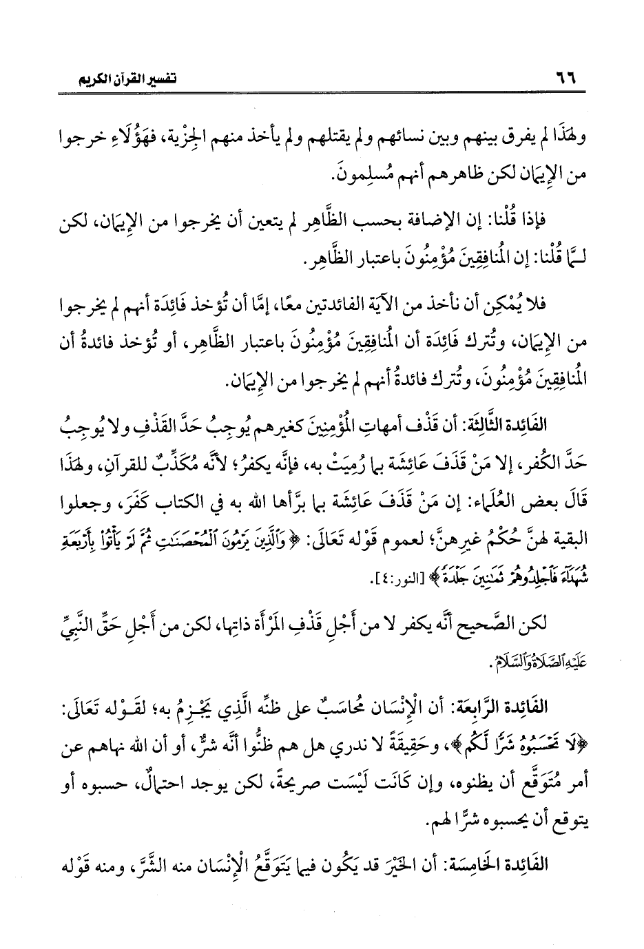 الفَائِدة الثَّالِثَة: أن قَذْف أمهاتِ المُؤْمِنِينَ كغيرهم يُوجِبُ حَدَّ القَذْفِ ولا يُوجِبُ حَدَّ الكُفر، إلَّا مَنْ قَذَفَ عَائِشَة بما رُميَتْ به، فإنَّه يكفرُ؛ لأنَّه مُكَذِّبٌ للقرآنِ، ولهَذَا قَالَ بعض العُلَماء: إن مَنْ قَذَفَ عَائِشَة بما برَّأها الله به في الكتاب كَفَرَ، وجعلوا البقية لهنَّ حُكْمُ غيرِهنَّ؛ لعموم قَوْله تَعَالَى: {وَالَّذِينَ يَرْمُونَ الْمُحْصَنَاتِ ثُمَّ لَمْ يَأْتُوا بِأَرْبَعَةِ شُهَدَاءَ فَاجْلِدُوهُمْ ثَمَانِينَ جَلْدَةً} [النور: ٤].