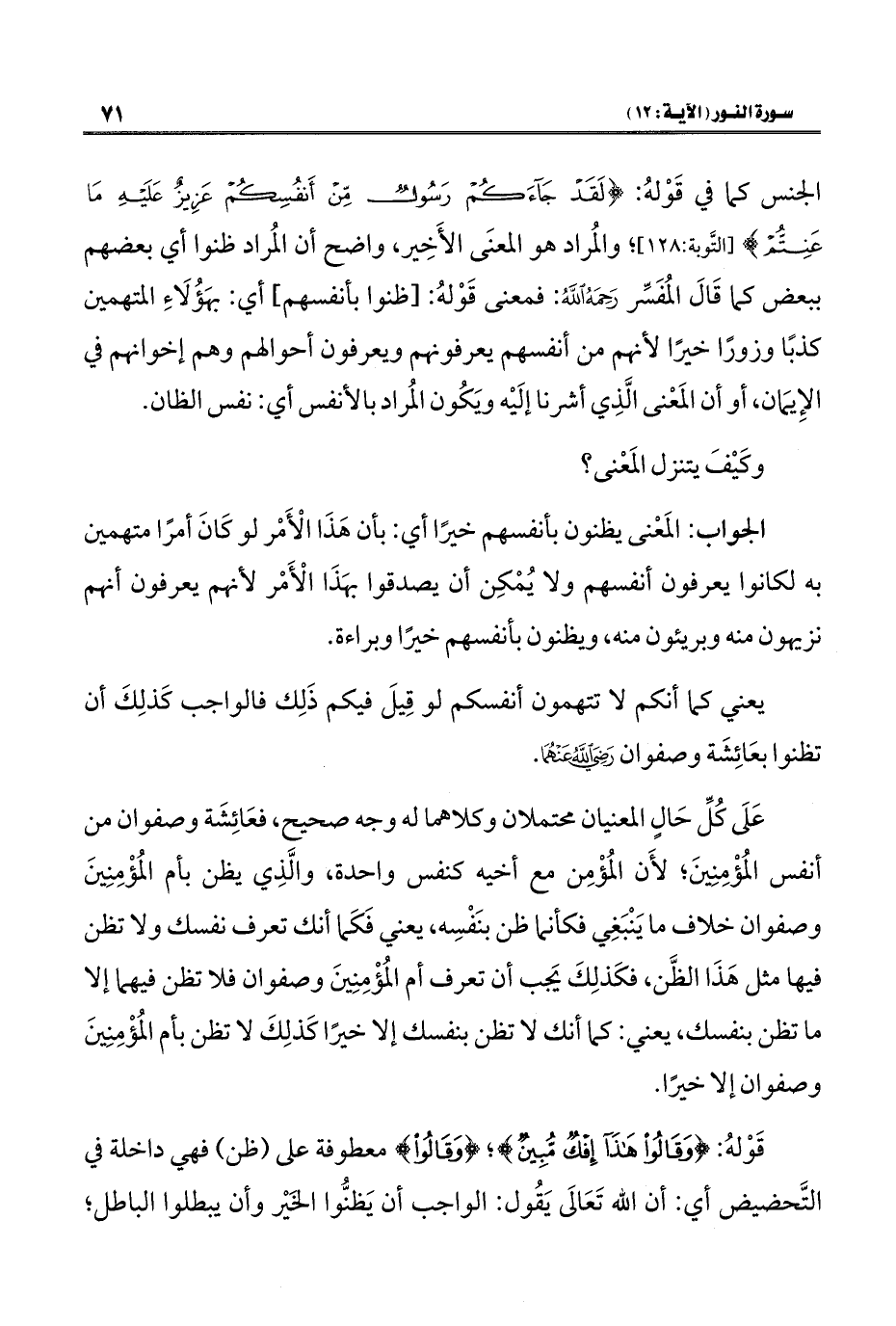 عَلَى كُلِّ حَالٍ المعنيان محتملان وكلاهما له وجه صحيح، فعَائِشَة وصفوان من أنفس المُؤْمِنِينَ؛ لأَنَّ المُؤْمِن مع أخيه كنفس واحدة، والَّذِي يظن بأم المُؤْمِنِينَ وصفوان خلاف ما يَنْبَغِي فكأنما ظن بنَفْسِه، يعني فَكَما أنك تعرف نفسك ولا تظن فيها مثل هَذَا الظَّن، فكَذلِكَ يَجب أن تعرف أم المُؤْمِنِينَ وصفوان فلا تظن فيهما إلَّا ما تظن بنفسك، يعني: كما أنك لا تظن بنفسك إلا خيرًا كَذلِكَ لا تظن بأم المُؤْمِنِينَ وصفوان إلا خيرًا.
