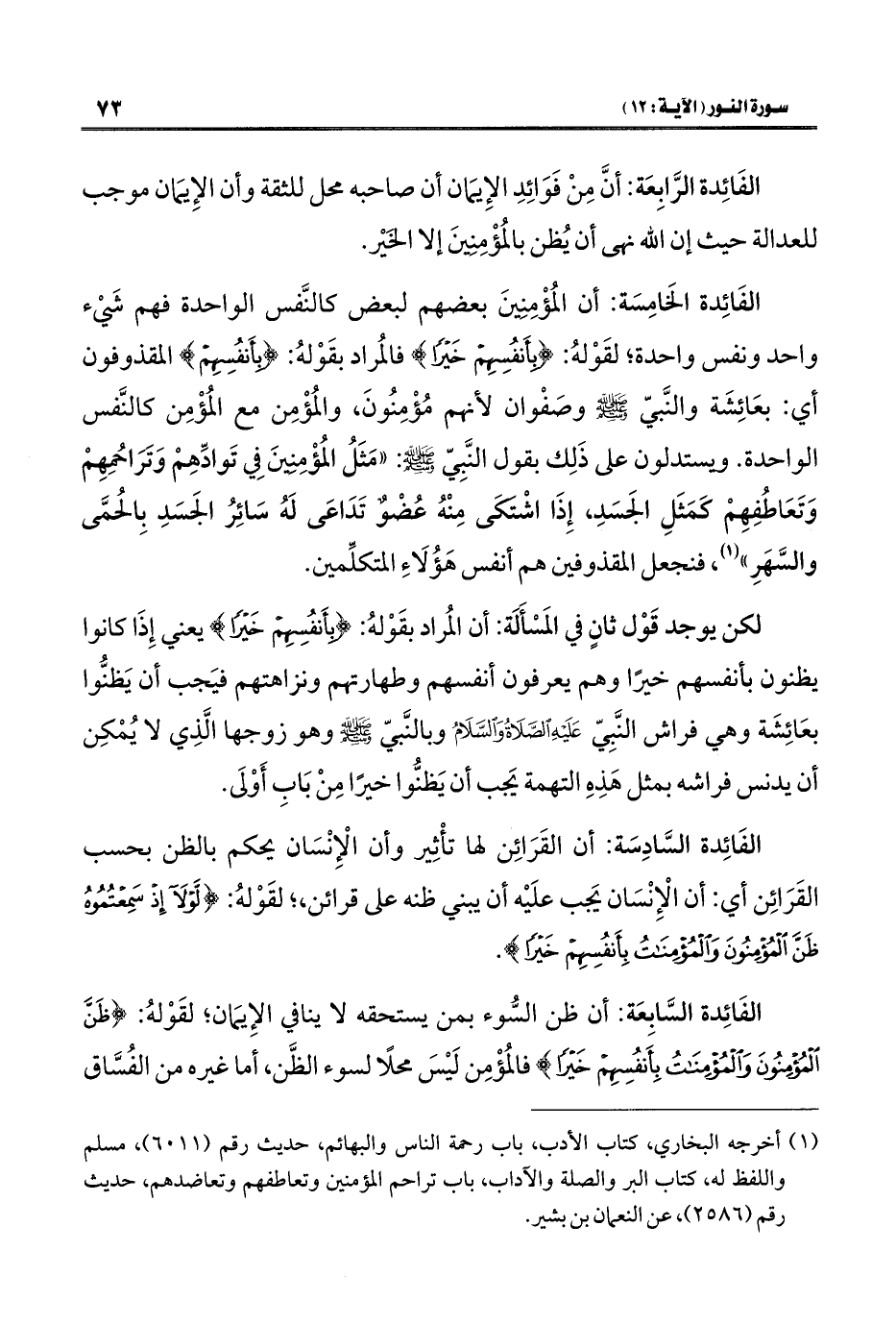 الفَائِدة الخَامِسَة: أن المُؤْمِنِينَ بعضهم لبعض كالنَّفس الواحدة فهم شَيْء واحد ونفس واحدة؛ لقَوْلهُ: {بِأَنْفُسِهِمْ خَيْرًا} فالمُراد بقَوْلهُ: {بِأَنْفُسِهِمْ} المقذوفون أي: بعَائِشَة والنَّبيّ - صلى الله عليه وسلم - وصَفْوان لأنهم مُؤْمِنُونَ، والمُؤْمِن مع المُؤْمِن كالنَّفس الواحدة. ويستدلون على ذَلِك بقول النَّبِيّ - صلى الله عليه وسلم -: "مَثَلُ المُؤْمِنِينَ فِي تَوادِّهِمْ وَترَاحُمِهِمْ وَتَعَاطُفِهِمْ كَمَثَلِ الجَسَدِ، إِذَا اشْتكَى مِنْهُ عُضْو تَدَاعَى لَهُ سَائِرُ الجَسَدِ بِالحُمَّى والسَّهَرِ" (¬١)، فنجعل المقذوفين هم أنفس هَؤُلَاءِ المتكلِّمين.