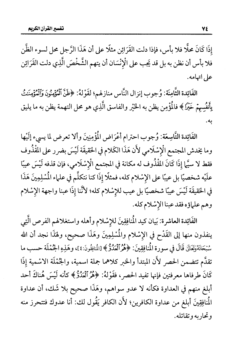 الفَائِدة التَّاسِعَة: وُجوب احترام أعْرَاض المُؤْمِنِينَ وألا تعرض لما يسيء إلَيْها وما يخدش المجتمع الْإِسْلَامي لأَنَّ هَذَا الكَلام في الحَقيقَة لَيْسَ بضرر على المقْذُوف فقط لا سيَّما إِذَا كَانَ المقْذُوف له مكانة في المجتمع الْإِسْلَامي، فإن قذفه لَيْسَ عيبًا علَيْه شخصيًا بل عيبًا على الإِسْلام كله، فمثلًا إِذَا كُنَّا نتكلَّم في علماء المُسْلِمِينَ هَذَا في الحَقيقَة لَيْسَ عيبًا شخصيًا بل عيب للإِسْلام كله؛ لأننا إِذَا عبنا واجهة الإِسْلام وهم علماؤه فقد عبنا الإِسْلام كله.