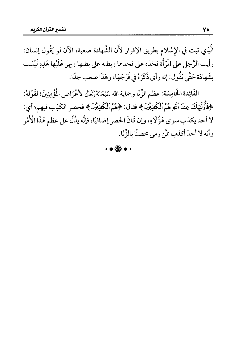 الفَائِدة الخَامِسَة: عظم الزِّنَا وحماية الله -سُبْحَانَهُ وَتَعَالَى- لأعْرَاض المُؤْمِنِينَ؛ لقَوْلهُ: {فَأُولَئِكَ عِنْدَ اللَّهِ هُمُ الْكَاذِبُونَ} فقال: {هُمُ الْكَاذِبُونَ} فحصر الكَذِب فيهم؛ أي: لا أحد يكذب سوى هَؤُلَاءِ، وإن كَانَ الحصر إضافيًّا، فإنَّه يدُلّ على عظم هَذَا الْأَمْر وأنَّه لا أحدَ أكذب ممَّن رمى محصنًا بالزِّنَا.