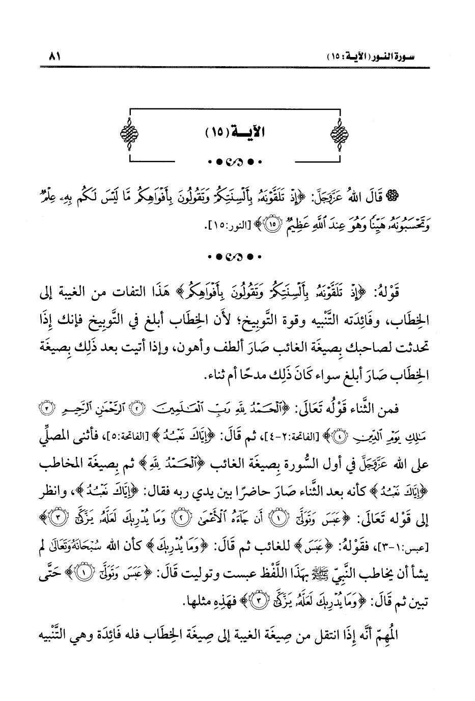 قَوْلهُ: {إِذْ تَلَقَّوْنَهُ بِأَلْسِنَتِكُمْ وَتَقُولُونَ بِأَفْوَاهِكُمْ} هَذَا التفات من الغيبة إلى الخِطَاب، وفَائِدَته التَّنْبيه وقوة التَّوبِيخ؛ لأَنَّ الخِطَاب أبلغ في التَّوبِيخ فإنَّك إِذَا تحدثت لصاحبك بِصيغَة الغائب صَارَ ألطف وأهون، وإذا أتيت بعد ذَلِك بِصيغَة الخِطَاب صَارَ أبلغ سواء كَانَ ذَلِك مدحًا أم ثناء.