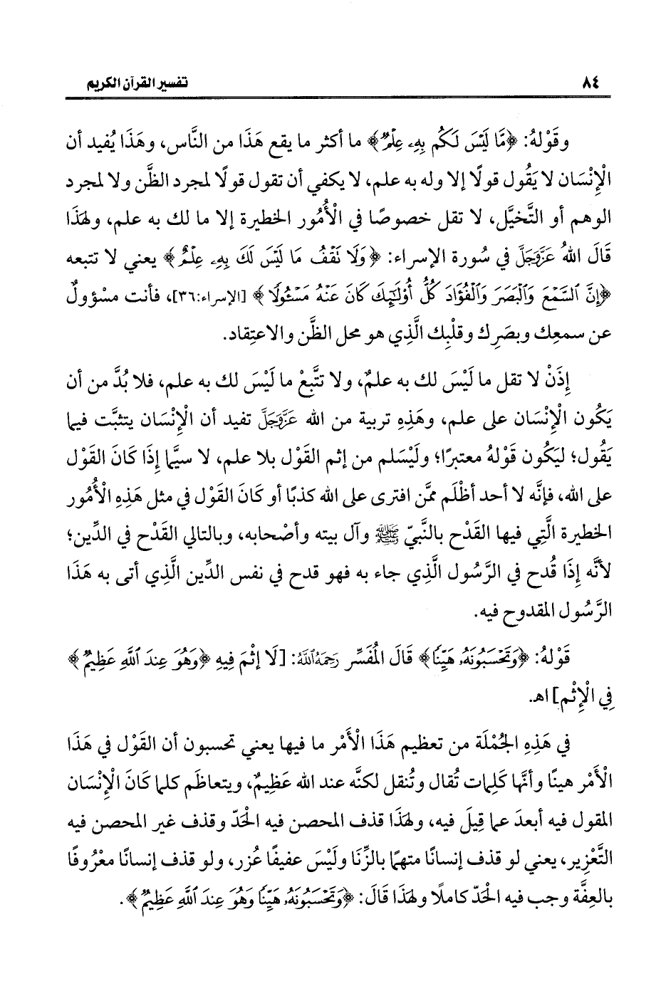 إِذَنْ لا تقل ما لَيْسَ لك به علم، ولا تتَّبعْ ما لَيْسَ لك به علم، فلا بُدَّ من أن يَكُون الْإِنْسَان على علم، وهَذِهِ تربية من الله -عَزَّ وَجَلَّ- تفيد أن الْإِنْسَان يتثبَّت فيما يَقُول؛ ليَكُون قَوْلهُ معتبرًا؛ ولَيْسَلم من إثم القَوْل بلا علم، لا سيَّما إِذَا كَانَ القَوْل على الله، فإنَّه لا أحد أظْلَم ممَّن افترى على الله كذبًا أو كَانَ القَوْل في مثل هَذِهِ الْأُمُور الخطيرة الَّتِي فيها القَدْح بالنَّبيّ - صلى الله عليه وسلم - وآل بيته وأصْحابه، وبالتالي القَدْح في الدِّين؛ لأنَّه إِذَا قُدح في الرَّسُول الَّذِي جاء به فهو قدح في نفس الدِّين الَّذِي أتى به هَذَا الرَّسُول المقدوح فيه.