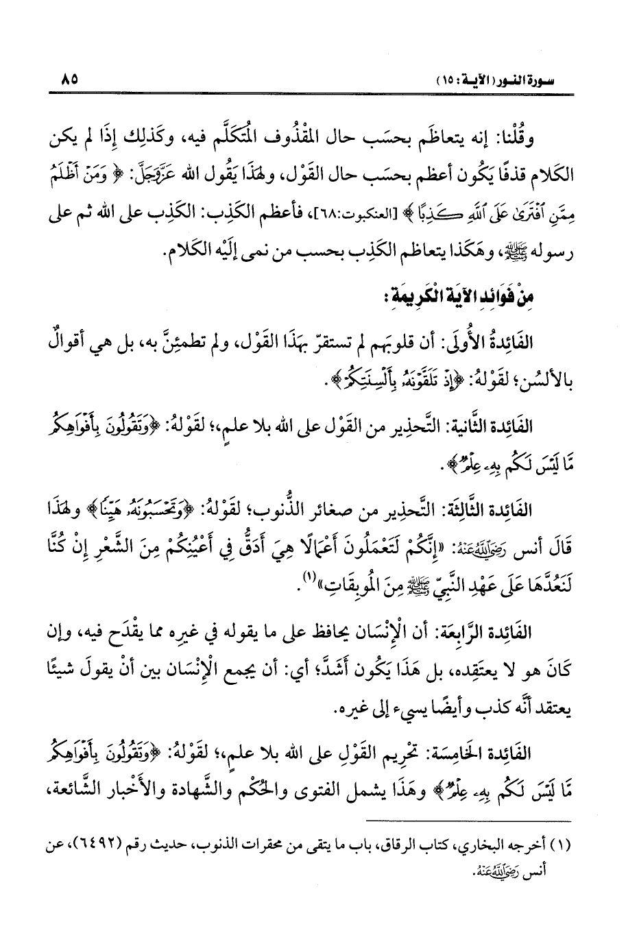 الفَائِدة الخَامِسَة: تحْرِيم القَوْلِ على الله بلا علمٍ، كما لقَوْلهُ: {وَتَقُولُونَ بِأَفْوَاهِكُمْ مَا لَيْسَ لَكُمْ بِهِ عِلْمٌ} وهَذَا يشمل الفتوى والحُكْم والشَّهادة والأَخْبار الشَّائعة،