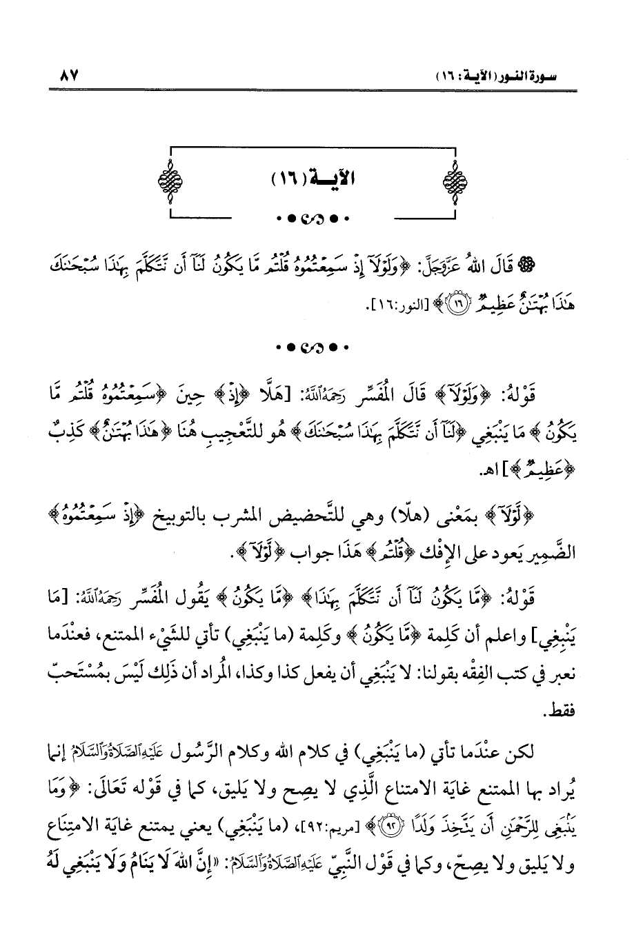 قَوْلهُ: {وَلَوْلَا} قَالَ المُفَسِّر -رَحِمَهُ اللهُ-: [هَلَّا {إِذْ} حِينَ {سَمِعْتُمُوهُ قُلْتُمْ مَا يَكُونُ} مَا يَنْبَغِي {لَنَا أَنْ نَتَكَلَّمَ بِهَذَا سُبْحَانَكَ} هُو للتَّعْجِيبِ هُنَا {هَذَا بُهْتَانٌ} كَذِبٌ {عَظِيمٌ}] اهـ.