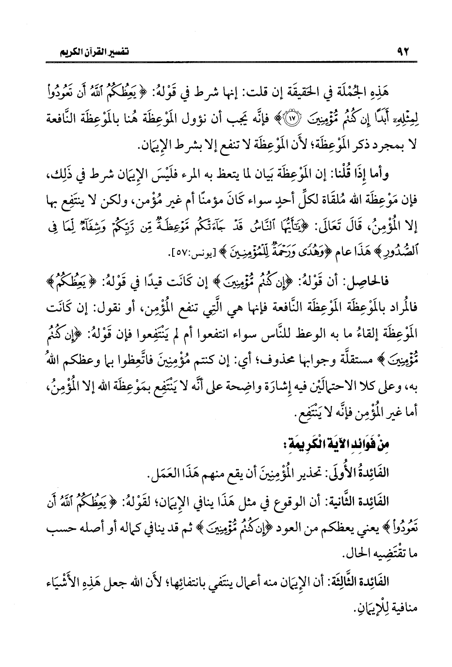 وأمَّا إِذَا قُلْنا: إن المَوْعِظَة بَيان لما يتعظ به المرء فلَيْسَ الإِيمَان شرط في ذَلِك، فإن مَوْعِظَة الله مُلقَاة لكلِّ أحدٍ سواء كَانَ مؤمنًا أم غير مُؤْمن، ولكن لا ينتَفِع بها إلَّا المُؤْمِنُ، قَالَ تَعَالَى: {يَاأَيُّهَا النَّاسُ قَدْ جَاءَتْكُمْ مَوْعِظَةٌ مِنْ رَبِّكُمْ وَشِفَاءٌ لِمَا فِي الصُّدُورِ} هَذَا عام {وَهُدًى وَرَحْمَةٌ لِلْمُؤْمِنِينَ} [يونس: ٥٧]. فالحاصِل: أن قَوْلهُ: {إِنْ كُنْتُمْ مُؤْمِنِينَ} إن كَانَت قيدًا في قَوْلهُ: {يَعِظُكُمُ} فالمُراد بالمَوْعِظَة المَوْعِظَة النَّافعة فإنَّها هي الَّتِي تنفع المُؤْمِن، أو نقول: إن كَانَت المَوْعِظَة إلقاءُ ما به الوعظ للنَّاس سواء انتفعوا أم لم يَنْتَفِعوا فإن قَوْلهُ: {إِنْ كُنْتُمْ مُؤْمِنِينَ} مستقلَّة وجوابها محذوف؛ أي: إن كنتم مُؤْمِنِينَ فاتَّعِظوا بما وعظكم اللهُ به، وعلى كلا الاحتمالَيْن فيه إِشارَة واضِحة على أنَّه لا يَنْتَفِع بمَوْعِظَة الله إلَّا المُؤْمِنُ، أما غير المُؤْمِن فإنَّه لا يَنتفِع.