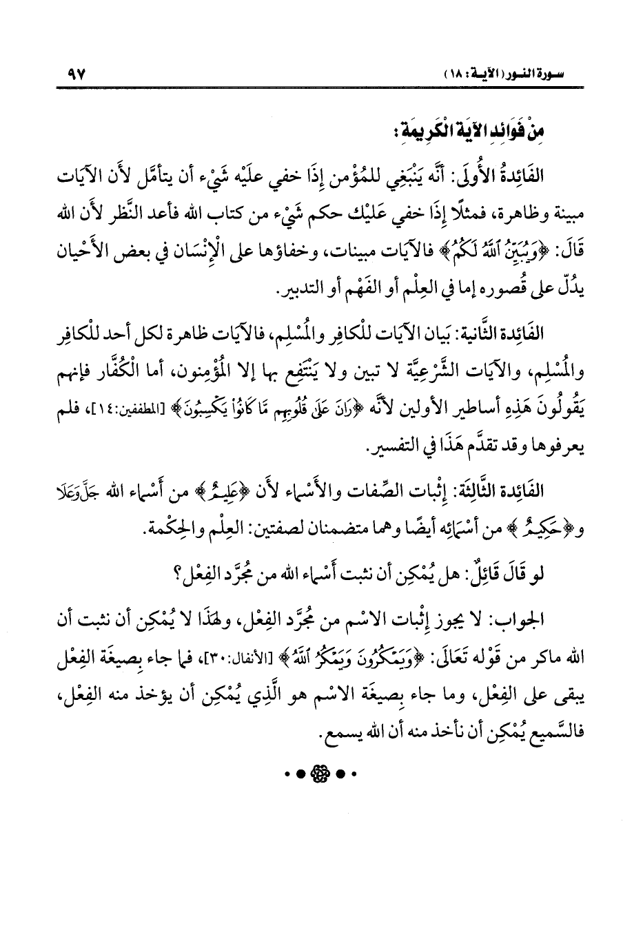 الفَائِدةُ الأُولَى: أنَّه يَنْبَغِي للمُؤْمن إِذَا خفي علَيْه شَيْء أن يتأمَّل لأَنَّ الآيَات مبينة وظاهرة، فمثلًا إِذَا خفي عَليْك حكم شَيْء من كتاب الله فأعد النَّظر لأَنَّ الله قَالَ: {وَيُبَيِّنُ اللَّهُ لَكُمُ} فالآيات مبينات، وخفاؤها على الْإِنْسَان في بعض الأَحْيان يدُلّ على قُصوره إمَّا في العِلْم أو الفَهْم أو التدبير.