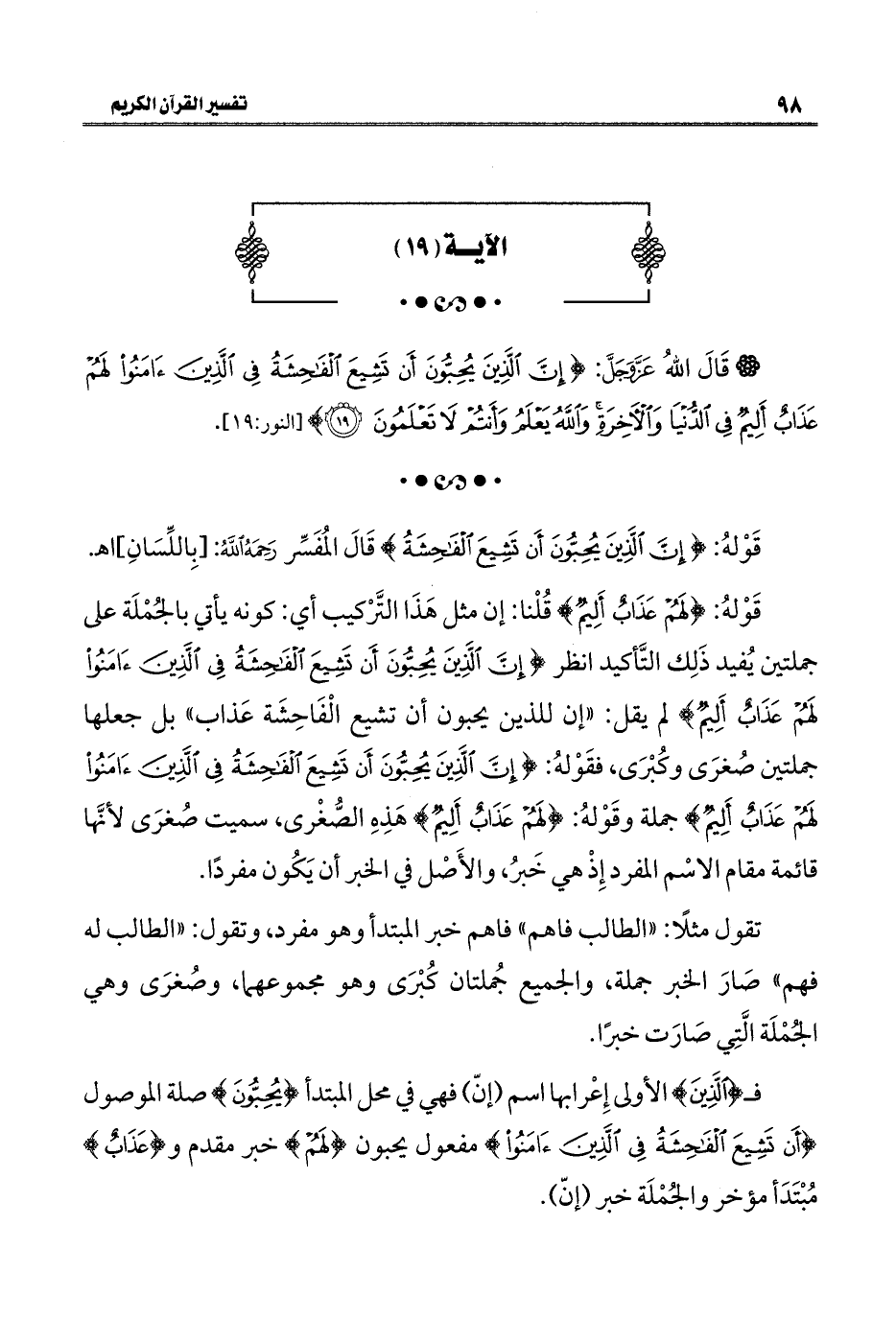 قَوْلهُ: {لَهُمْ عَذَابٌ أَلِيمٌ} قُلْنا: إن مثل هَذَا التَّرْكيب أي: كونه يأتي بالجُمْلَة على جملتين يُفيد ذَلِك التَّأكيد انظر {إِنَّ الَّذِينَ يُحِبُّونَ أَنْ تَشِيعَ الْفَاحِشَةُ فِي الَّذِينَ آمَنُوا لَهُمْ عَذَابٌ أَلِيمٌ} لم يقل: "إن للذين يحبون أن تشيع الْفَاحِشَة عَذاب" بل جعلها جملتين صُغرَى وكُبْرَى، فقَوْلهُ: {إِنَّ الَّذِينَ يُحِبُّونَ أَنْ تَشِيعَ الْفَاحِشَةُ فِي الَّذِينَ آمَنُوا لَهُمْ عَذَابٌ أَلِيمٌ} جملة وقَوْلهُ: {لَهُمْ عَذَابٌ أَلِيمٌ} هَذِهِ الصُّغْرى، سميت صُغرَى لأنَّها قائمة مقام الاسْم المفرد إِذْ هي خَبرُ، والأَصْل في الخبر أن يَكُون مفردًا.