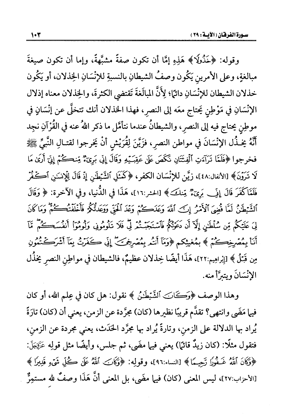وقوله: {خَذُولًا} هَذِهِ إمَّا أن تكون صفةً مشبَّهةً، وإما أن تكون صيغةَ مبالغةٍ، وعلى الأمرينِ يَكُون وصفُ الشيطانِ بالنسبةِ للإنْسَانِ الخِذلان، أو يَكُون خذلان الشيطان للإنْسَانِ دائمًا؛ لِأَنَّ المبالَغةَ تَقتضي الكثرةَ، والخِذلان معناه إذلال الإنْسَانِ في مَوْطِنٍ يَحتاج معَه إلى النصرِ، فهذا الخذلان أنك تتخلَّى عن إنْسَانٍ في موطِنٍ يحتاج فيه إلى النصرِ، والشيطانُ عندما نتأمَّل ما ذكر اللَّهُ عنه في القُرْآنِ نجِد أَنَّهُ يخذُل الإنْسَانَ في مواطن النصرِ، فزَيَّنَ لِقُرَيْشٍ أنْ يَخرجوا لقتالِ النَّبيِّ -صلى اللَّه عليه وسلم- فخرجوا {فَلَمَّا تَرَاءَتِ الْفِئَتَانِ نَكَصَ عَلَى عَقِبَيْهِ وَقَالَ إِنِّي بَرِيءٌ مِنْكُمْ إِنِّي أَرَى مَا لَا تَرَوْنَ} [الأنفال: ٤٨]، زيَّن للإنْسَان الكفر، {كَمَثَلِ الشَّيْطَانِ إِذْ قَالَ لِلْإِنْسَانِ اكْفُرْ فَلَمَّا كَفَرَ قَالَ إِنِّي بَرِيءٌ مِنْكَ} [الحشر: ١٦]، هَذَا في الدُّنيا، وفي الآخرة: {وَقَالَ الشَّيْطَانُ لَمَّا قُضِيَ الْأَمْرُ إِنَّ اللَّهَ وَعَدَكُمْ وَعْدَ الْحَقِّ وَوَعَدْتُكُمْ فَأَخْلَفْتُكُمْ وَمَا كَانَ لِيَ عَلَيْكُمْ مِنْ سُلْطَانٍ إِلَّا أَنْ دَعَوْتُكُمْ فَاسْتَجَبْتُمْ لِي فَلَا تَلُومُونِي وَلُومُوا أَنْفُسَكُمْ مَا أَنَا بِمُصْرِخِكُمْ} بمُغيثِكم {وَمَا أَنْتُمْ بِمُصْرِخِيَّ إِنِّي كَفَرْتُ بِمَا أَشْرَكْتُمُونِ مِنْ قَبْلُ} [إِبْراهِيم: ٢٢]، هَذَا أيضًا خِذلان عظيمٌ، فالشيطان في مواطِنِ النصرِ يخذُل الإنْسَانَ ويتبرَّأ منه.