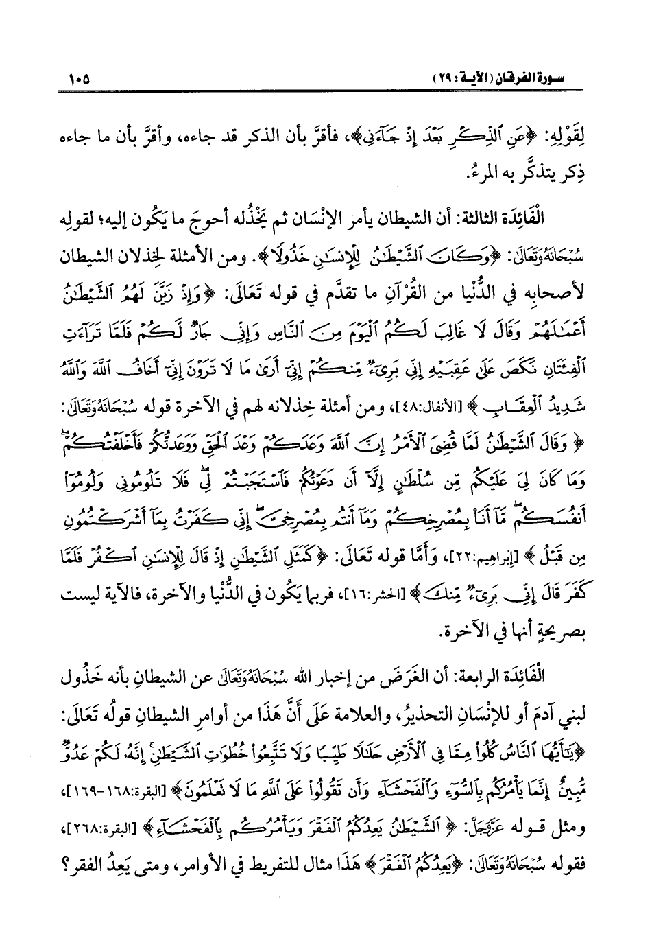 الْفَائِدَة الرابعة: أن الغَرَضَ من إخبار اللَّه سُبْحَانَهُ وَتَعَالَى عن الشيطانِ بأنه خَذُول لبني آدمَ أو للإنْسَانِ التحذيرُ، والعلامة عَلَى أَنَّ هَذَا من أوامرِ الشيطانِ قولُه تَعَالَى: {يَاأَيُّهَا النَّاسُ كُلُوا مِمَّا فِي الْأَرْضِ حَلَالًا طَيِّبًا وَلَا تَتَّبِعُوا خُطُوَاتِ الشَّيْطَانِ إِنَّهُ لَكُمْ عَدُوٌّ مُبِينٌ (١٦٨) إِنَّمَا يَأْمُرُكُمْ بِالسُّوءِ وَالْفَحْشَاءِ وَأَنْ تَقُولُوا عَلَى اللَّهِ مَا لَا تَعْلَمُونَ} [البقرة: ١٦٨ - ١٦٩]، ومثل قوله عَزَّ وَجَلَّ: {الشَّيْطَانُ يَعِدُكُمُ الْفَقْرَ وَيَأْمُرُكُمْ بِالْفَحْشَاءِ} [البقرة: ٢٦٨]، فقوله سُبْحَانَهُ وَتَعَالَى: {يَعِدُكُمُ الْفَقْرَ} هَذَا مثال للتفريط في الأوامر، ومتى يَعِدُ الفقر؟