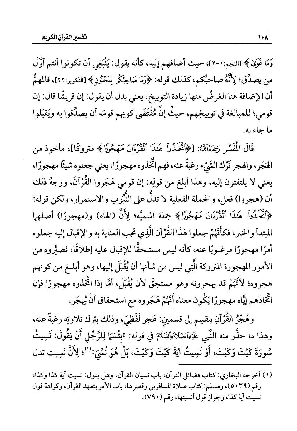 قَالَ المُفَسِّر رَحِمَهُ اللَّهُ: [{اتَّخَذُوا هَذَا الْقُرْآنَ مَهْجُورًا} متروكًا]، مأخوذ من الهَجْر، والهجر تَرْك الشَيْء رغبةً عنه، فهم اتَّخذوه مهجورًا، يعني جعلوه شيئًا مهجورًا، يعني لا يلتفتون إليه، وهذا أبلغ من قولِه: إن قومي هَجَروا القُرْآنَ، ووجهُ ذلك أن (هجروا) فعل، والجملة الفعلية لا تدلُّ على الثُّبُوتِ والاستمرار، ولكن قوله: {اتَّخَذُوا هَذَا الْقُرْآنَ مَهْجُورًا} جملة اسْميَّة؛ لِأَنَّ (الهاء) و (مهجورًا) أصلهما المبتدأ والخبر، فكأَنَّهُمْ جعلوا هَذَا القُرْآن الَّذِي تجب العناية به والإقبال إليه جعلوه أمرًا مهجورًا مرغوبًا عنه، كأنه ليس مستحقًّا للإقبال عليه إطلاقًا، فصيَّروه من الأمور المهجورة المتروكة الَّتِي ليس من شأنها أن يُقْبَلَ إليها، وهو أبلغ من كونهم هجروه؛ لأَنَّهُمْ قد يهجرونه وهو مستحِقّ لأن يُقْبَلَ، أمَّا إذا اتَّخذوه مهجورًا فإن اتِّخاذهم إيَّاه مهجورًا يَكُون معناه أَنَّهُمْ هَجَروه مع استحقاق أنْ يُهجَر.