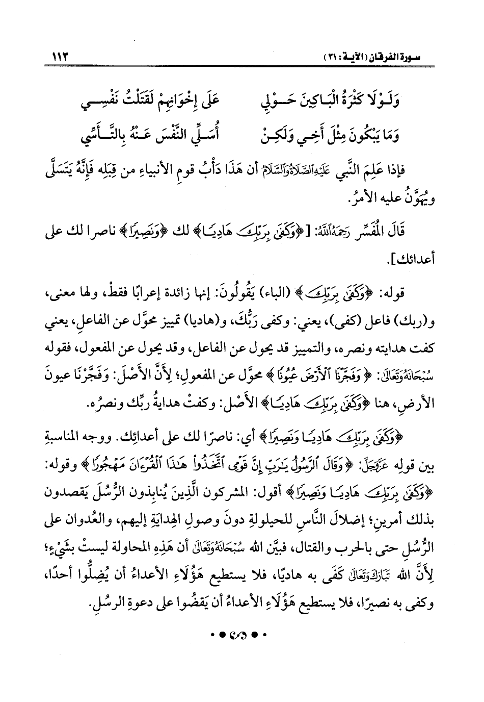 قَالَ المُفَسِّر رَحِمَهُ اللَّهُ: [{وَكَفَى بِرَبِّكَ هَادِيًا} لك {وَنَصِيرًا} ناصرا لك على أعدائك].