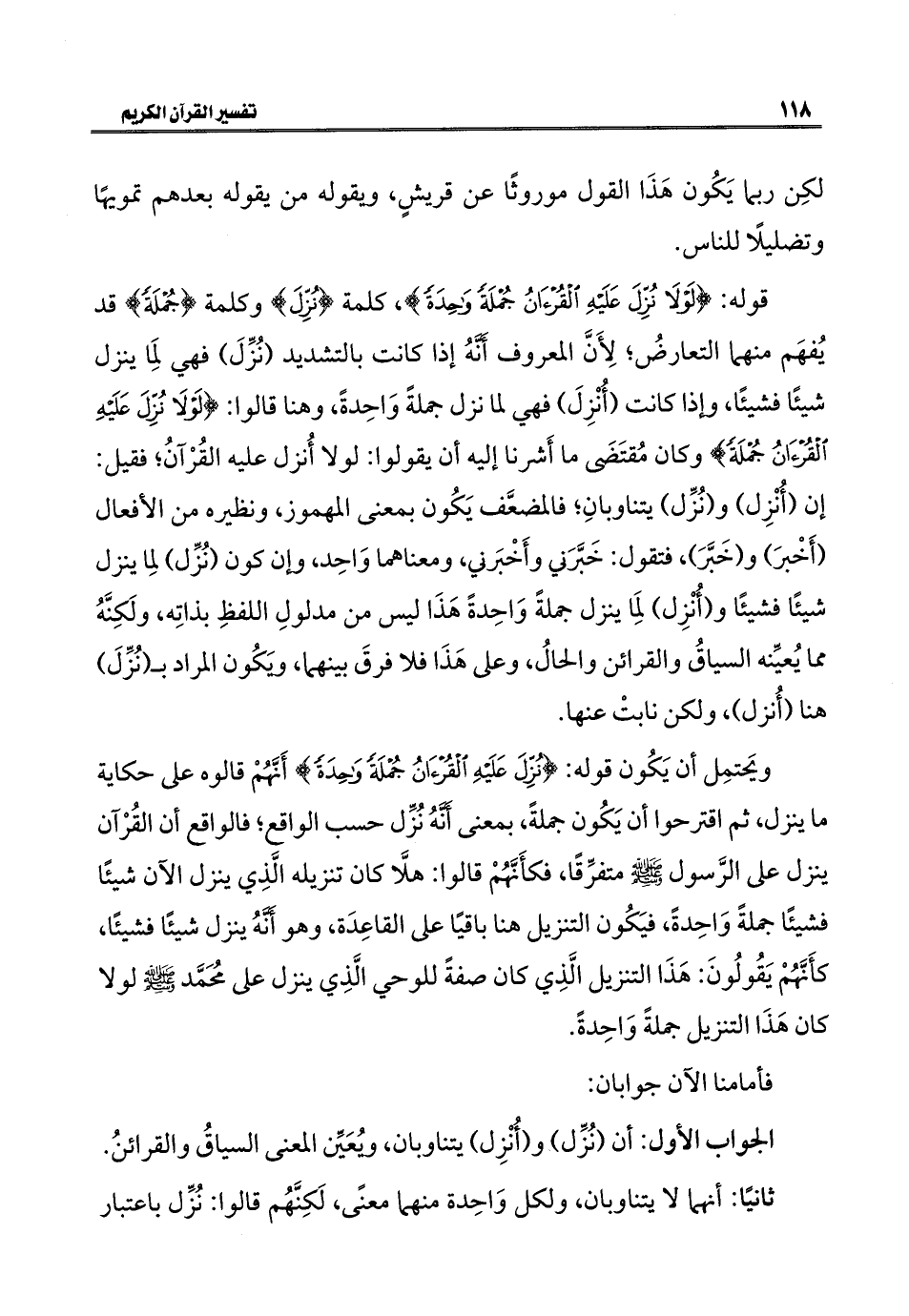 قوله: {لَوْلَا نُزِّلَ عَلَيْهِ الْقُرْآنُ جُمْلَةً وَاحِدَةً}، كلمة {نُزِّلَ} وكلمة {جُمْلَةً} قد يُفهَم منهما التعارضُ؛ لِأَنَّ المعروف أَنَّهُ إذا كانت بالتشديد (نُزِّلَ) فهي لِمَا ينزل شيئًا فشيئًا، وإذا كانت (أُنْزِلَ) فهي لما نزل جملةً وَاحِدةً، وهنا قالوا: {لَوْلَا نُزِّلَ عَلَيْهِ الْقُرْآنُ جُمْلَةً} وكان مُقتَضَى ما أَشرنا إليه أن يقولوا: لولا أُنزل عليه القُرْآنُ؛ فقيل: إن (أُنْزِل) و (نُزِّل) يتناوبانِ؛ فالمضعَّف يَكُون بمعنى المهموز، ونظيره من الأفعال (أَخْبرَ) و (خَبَّرَ)، فتقول: خَبَّرَني وأَخْبَرني، ومعناهما وَاحِد، وإن كون (نُزِّل) لمِا ينزل شيئًا فشيئًا و (أُنْزِل) لِمَا ينزل جملةً وَاحِدةً هَذَا ليس من مدلولِ اللفظِ بذاتِه، ولَكِنَّهُ مما يُعيِّنه السياقُ والقرائن والحالُ، وعلى هَذَا فلا فرقَ بينهما، ويَكُون المراد بـ (نُزِّلَ) هنا (أُنزل)، ولكن نابتْ عنها.