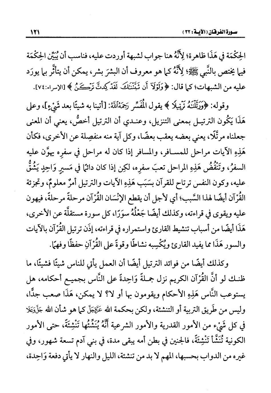 وقوله: {وَرَتَّلْنَاهُ تَرْتِيلًا} يقول المُفَسِّر رَحِمَهُ اللَّهُ: [أتينا به شيئًا بعد شَيْءٍ]، وعلى هَذَا يَكُون الترتيل بمعنى التنزيل، وعندي أن الترتيل أخصُّ، يعني أن المعنى جعلناه مرتَّلًا، يعني بعضه يعقب بعضًا، وكل آية منه منفصِلة عن الأخرى، فكأن هَذِهِ الآيات مراحل للمسافر، والمسافر إذا كان له مراحل في سفرِه يهوَّن عليه السفرُ، وتَنْقُضُ هَذِهِ المراحل تعبَ سفرِه، لكِن إذا كان دائمًا في مَسيرٍ وَاحِدٍ يَشُقُّ عليه، وكون النفس ترتاح للقرآن بسَبَب هَذِهِ الآيات والترتيل أمرٌ معلومٌ، وتجزئة القُرْآن أيضًا لهذا السَّبب؛ أي لأجل أن يقطع الإنْسَان القُرْآن مرحلةً مرحلةً، فيهون عليه ويقوى في قراءته، وكذلك أيضًا جَعْلُهُ سوَرًا، كل سورة مستقلَّة عن الأخرى، هَذَا أيضًا من أسباب تنشيط القارئ واستمراره في قراءته، إذَن ترتيل القُرْآن بالآيات والسور هَذَا مما يفيد القارئ ويُكْسِبه نشاطًا وقوةً على القُرْآنِ حفظًا وفهمًا.