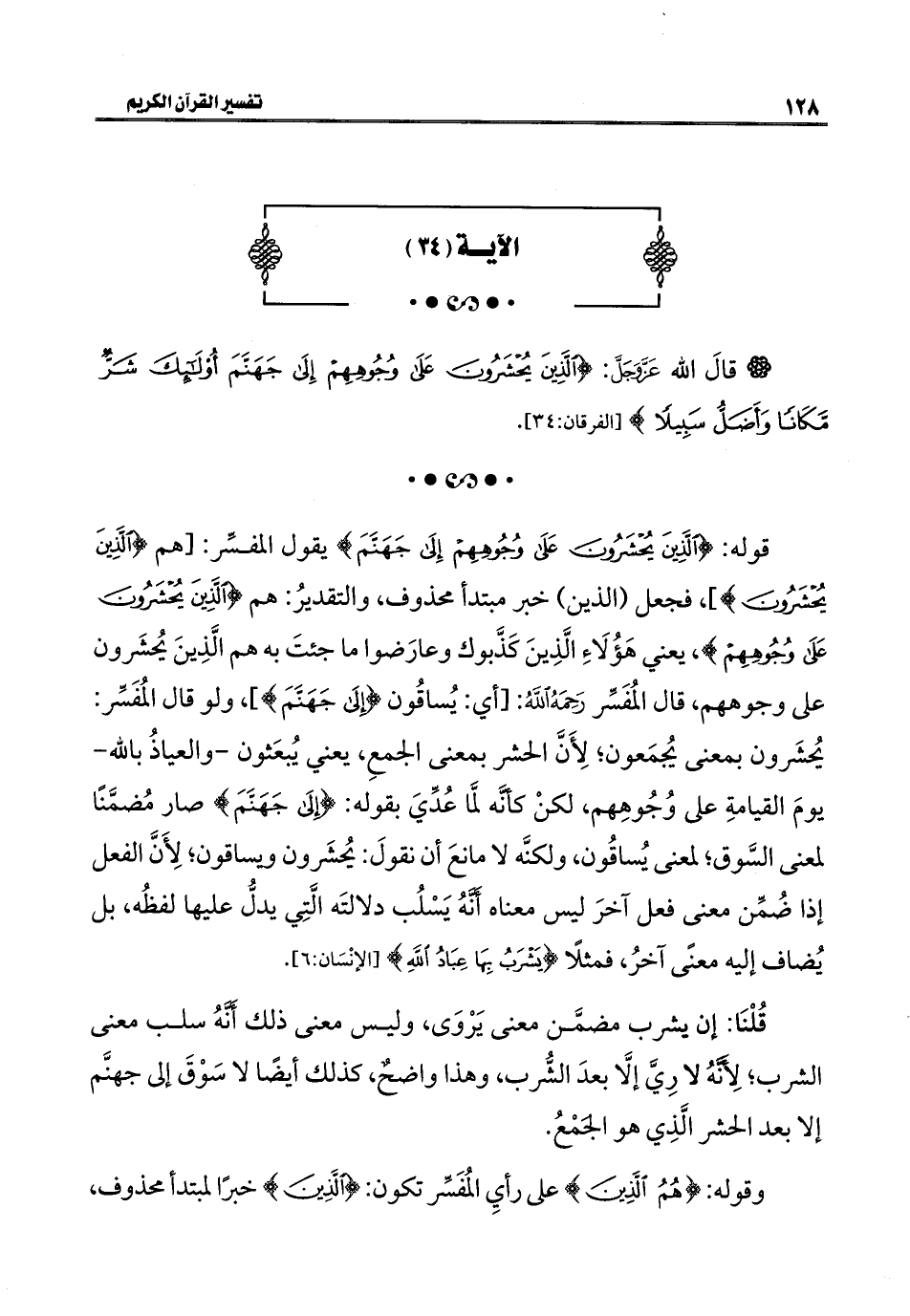 قوله: {الَّذِينَ يُحْشَرُونَ عَلَى وُجُوهِهِمْ إِلَى جَهَنَّمَ} يقول المفسِّر: [هم {الَّذِينَ يُحْشَرُونَ}]، فجعل (الذين) خبر مبتدأ محذوف، والتقديرُ: هم {الَّذِينَ يُحْشَرُونَ عَلَى وُجُوهِهِمْ}، يعني هَؤُلَاءِ الَّذِينَ كَذَّبوك وعارَضوا ما جئتَ به هم الَّذِينَ يُحشَرون على وجوههم، قال المُفَسِّر رَحِمَهُ اللَّهُ: [أي: يُساقُون {إِلَى جَهَنَّمَ}، ولو قال المُفَسِّر: يُحشَرون بمعنى يُجمَعون؛ لِأَنَّ الحشر بمعنى الجمعِ، يعني يُبعَثون -والعياذُ باللَّه- يومَ القيامةِ على وُجُوهِهم، لكنْ كأنَّه لمَّا عُدِّيَ بقوله: {إِلَى جَهَنَّمَ} صار مُضمَّنًا لمعنى السَّوق؛ لمعنى يُساقُون، ولكنَّه لا مانعَ أن نقولَ: يُحشَرون ويساقون؛ لِأَنَّ الفعل إذا ضُمِّن معنى فعل آخرَ ليس معناه أَنَّهُ يَسْلُب دلالتَه الَّتِي يدلُّ عليها لفظُه، بل يُضاف إليه معنًى آخرُ، فمثلًا {يَشْرَبُ بِهَا عِبَادُ اللَّهِ} [الإنسان: ٦].