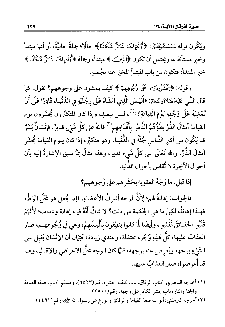 وقوله: {يُحْشَرُونَ عَلَى وُجُوهِهِمْ} كيف يمشون على وجوههم؟ نقول: كما قال النَّبي عَلَيْهِ الصَّلَاةُ وَالسَّلَامُ: "أَلَيْسَ الَّذِي أَمْشَاهُ عَلَى رِجْلَيْهِ فِي الدُّنْيَا، قَادِرًا عَلَى أَنْ يُمْشِيَهُ عَلَى وَجْهِهِ يَوْمَ الْقِيَامَةِ؟ " (¬١)، ليس ببعيدٍ، وإذا كان المتكبِّرون يُحشَرون يوم القيامة أمثالَ الذَّرِّ يَطَؤُهُمُ النَّاسُ بِأَقْدَامِهِم (¬٢) فاللَّهُ على كلِّ شَيْءٍ قديرٌ، فإنْسَانٌ بَشَرٌ قد يَكُون من أكبرِ النَّاسِ جُثَّةً في الدُّنْيا، وهو متكبِّر، إذا كان يوم القيامة يُحشَر أمثالَ الذَّرِّ، واللَّه تَعَالَى على كلِّ شَيْء قدير، وهذا مثالٌ مِما سبق الإشارةُ إليه بأن أحوال الآخِرة لا تُقاس بأحوال الدُّنيا.