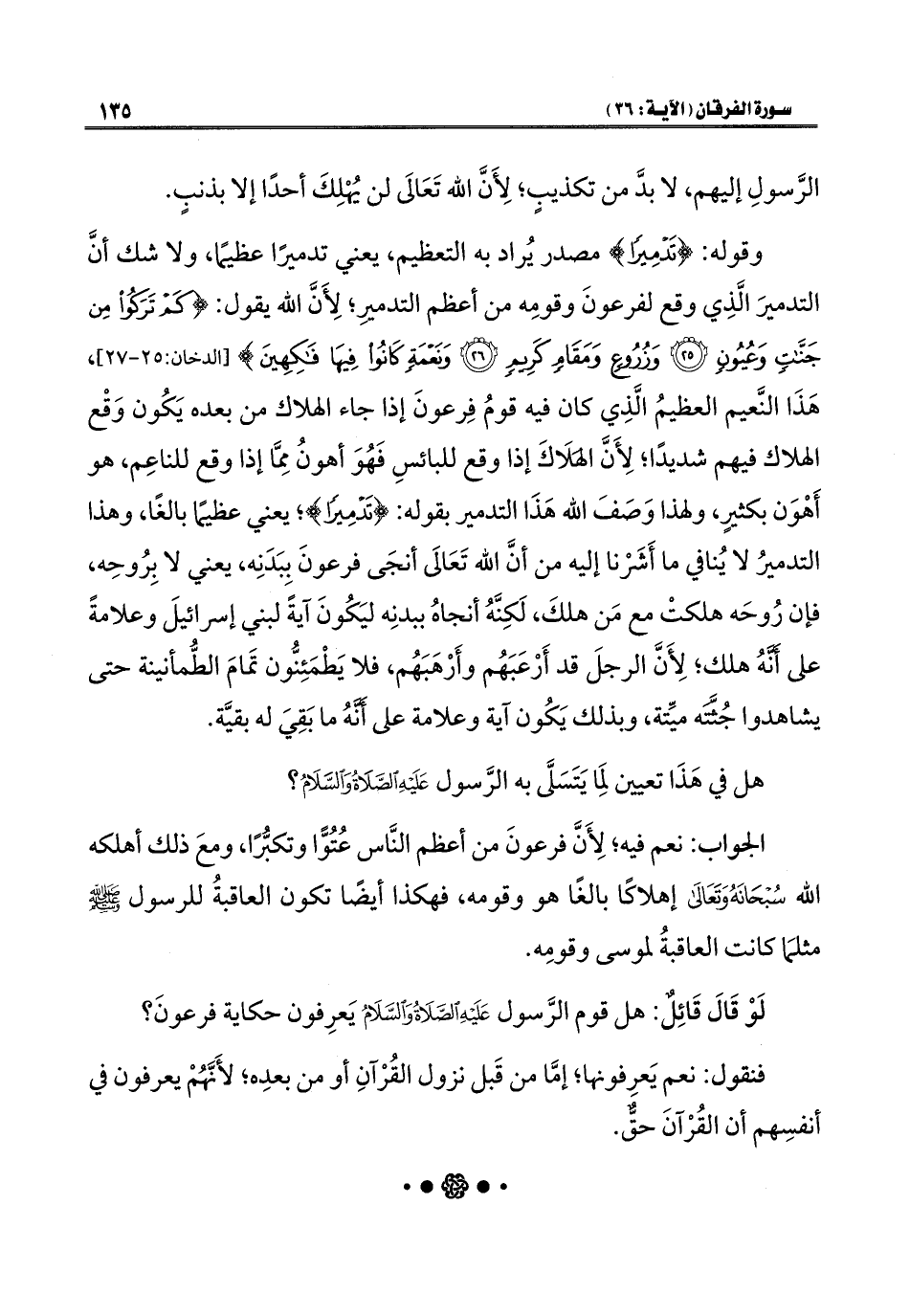 وقوله: {تَدْمِيرًا} مصدر يُراد به التعظيم، يعني تدميرًا عظيمًا، ولا شك أنَّ التدميرَ الَّذِي وقع لفرعونَ وقومِه من أعظم التدميرِ؛ لِأَنَّ اللَّه يقول: {كَمْ تَرَكُوا مِنْ جَنَّاتٍ وَعُيُونٍ (٢٥) وَزُرُوعٍ وَمَقَامٍ كَرِيمٍ (٢٦) وَنَعْمَةٍ كَانُوا فِيهَا فَاكِهِينَ} [الدخان: ٢٥ - ٢٧]، هَذَا النَّعيم العظيمُ الَّذِي كان فيه قومُ فِرعونَ إذا جاء الهلاك من بعده يَكُون وَقْع الهلاك فيهم شديدًا؛ لِأَنَّ الهَلَاكَ إذا وقع للبائسِ فَهُوَ أهونُ مِمَّا إذا وقع للناعِم، هو أَهْوَن بكثيرٍ، ولهذا وَصَفَ اللَّه هَذَا التدمير بقوله: {تَدْمِيرًا}؛ يعني عظيمًا بالغًا، وهذا التدميرُ لا يُنافي ما أَشَرْنا إليه من أنَّ اللَّه تَعَالَى أنجَى فرعونَ بِبَدَنِه، يعني لا بِرُوحِه، فإن رُوحَه هلكتْ مع مَن هلكَ، لَكِنَّهُ أنجاهُ ببدنِه ليَكُونَ آيةً لبني إسرائيلَ وعلامةً على أَنَّهُ هلك؛ لِأَنَّ الرجلَ قد أَرْعَبَهُم وأَرْهَبَهُم، فلا يَطْمَئِنُّون تمَامَ الطُّمأنينة حتى يشاهدوا جُثَّتَه ميِّتة، وبذلك يَكُون آية وعلامة على أَنَّهُ ما بَقِيَ له بقيَّة.