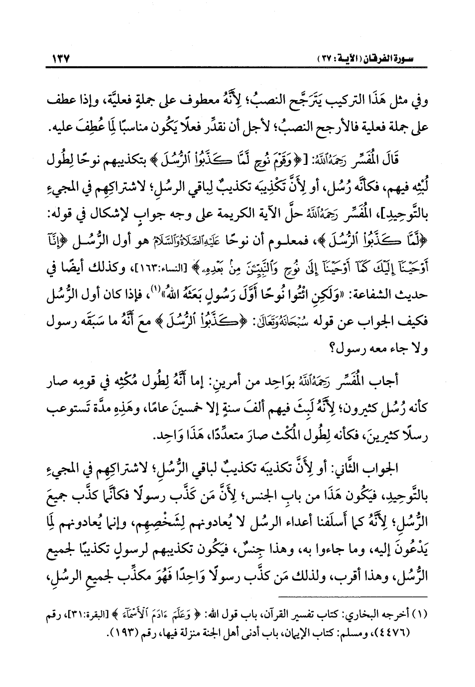 قَالَ المُفَسِّر رَحِمَهُ اللَّهُ: [{وَقَوْمَ نُوحٍ لَمَّا كَذَّبُوا الرُّسُلَ} بتكذيبهم نوحًا لِطُول لُبْثِه فيهم، فكأنَّه رُسُل، أو لِأَنَّ تَكْذِيبَه تكذيبٌ لِباقي الرسُلِ؛ لاشتراكِهِم في المجيءِ بالتَّوحِيدِ]، المُفَسِّر رَحِمَهُ اللَّهُ حلَّ الآية الكريمة على وجه جوابٍ لإشكال في قوله: {لَمَّا كَذَّبُوا الرُّسُلَ}، فمعلوم أن نوحًا عَلَيْهِ الصَّلَاةُ وَالسَّلَامُ هو أول الرُّسُل {إِنَّا أَوْحَيْنَا إِلَيْكَ كَمَا أَوْحَيْنَا إِلَى نُوحٍ وَالنَّبِيِّينَ مِنْ بَعْدِهِ} [النساء: ١٦٣]، وكذلك أيضًا في حديث الشفاعة: "وَلَكِنِ ائْتُوا نُوحًا أَوَّلَ رَسُولٍ بَعَثَهُ اللَّهُ" (¬١)، فإذا كان أول الرُّسُل فكيف الجواب عن قوله سُبْحَانَهُ وَتَعَالَى: {كَذَّبُوا الرُّسُلَ} معَ أَنَّهُ ما سَبَقَه رسول ولا جاء معه رسول؟