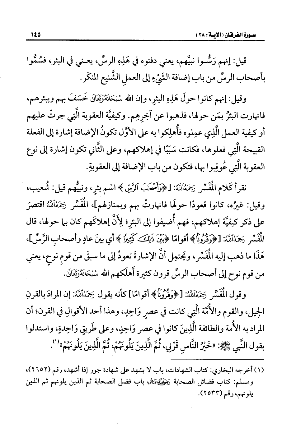 نقرأ كَلام المُفَسِّر رَحِمَهُ اللَّهُ: [{وَأَصْحَابُ الرَّسِّ} اسْم بئرٍ، ونبيُّهم قيل: شُعيب، وقيل: غيرُه، كانوا قعودًا حولَها فانهارتْ بهم وبمنازلهم]، المُفَسِّر رَحِمَهُ اللَّهُ اقتصرَ على ذكر كيفيَّة إهلاكهم، فهم أُضيفوا إلى البئرِ؛ لِأَنَّ إهلاكَهم كان بما حولها، قال المُفَسِّر رَحِمَهُ اللَّهُ: [{وَقُرُونًا} أقوامًا {بَيْنَ ذَلِكَ كَثِيرًا} أي بينَ عادٍ وأصحابِ الرَّسِّ]، هَذَا ما ذهب إليه المُفَسِّر، ويَحتمِل أنَّ الإشارةَ تعودُ إلى ما سبقَ من قومِ نوحٍ، يعني من قوم نوح إلى أصحاب الرسِّ قرون كثيرة أَهلَكهم اللَّه سُبْحَانَهُ وَتَعَالَى.