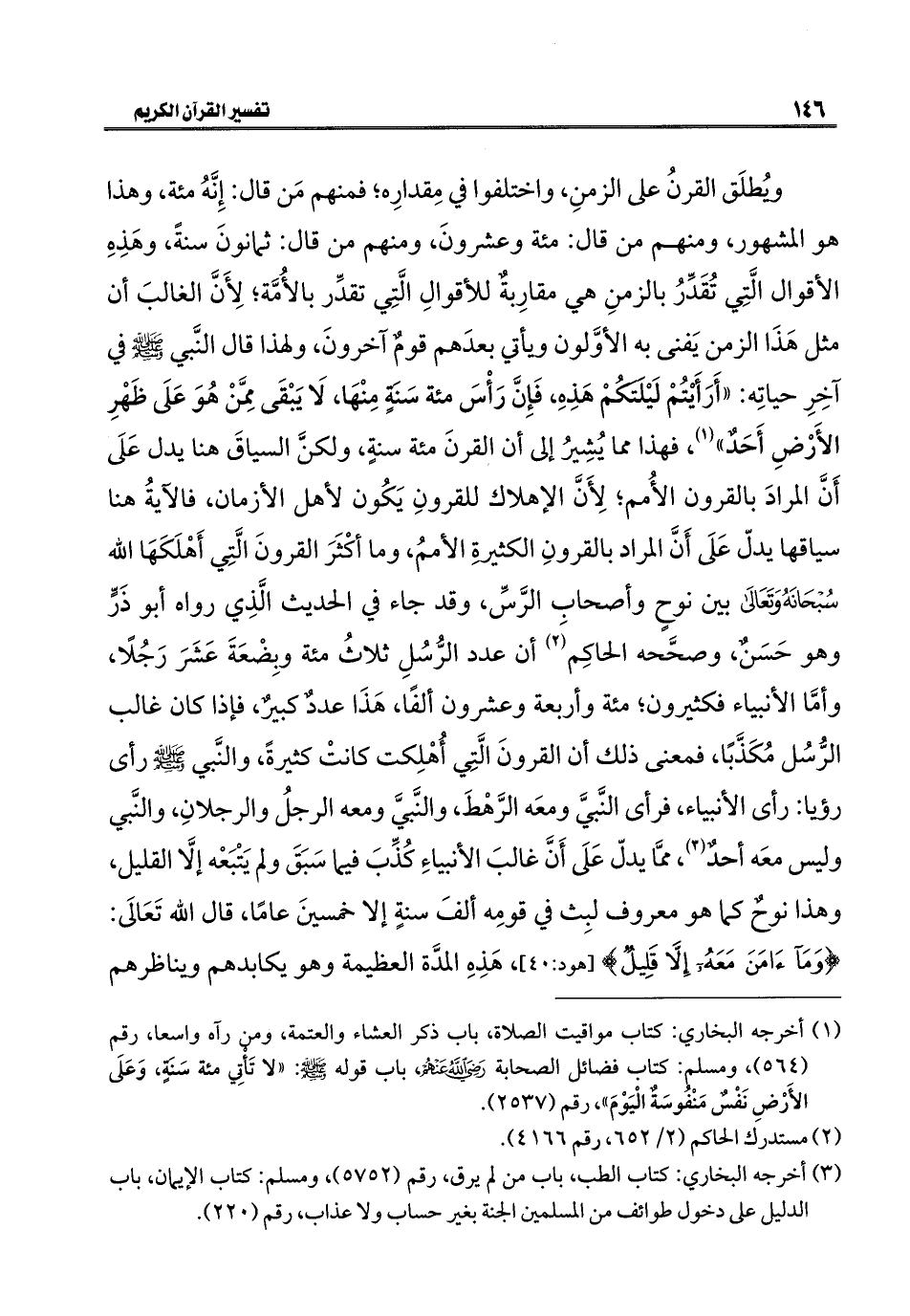 ويُطلَق القرنُ على الزمنِ، واختلفوا في مِقدارِه؛ فمنهم مَن قال: إِنَّهُ مئة، وهذا هو المشهور، ومنهم من قال: مئة وعشرونَ، ومنهم من قال: ثمانونَ سنة، وهَذِهِ الأقوال الَّتِي تُقَدِّرُ بالزمنِ هي مقارِبةٌ للأقوالِ الَّتِي تقدِّر بالأُمَّة؛ لِأَنَّ الغالبَ أن مثل هَذَا الزمن يَفنى به الأوَّلون ويأتي بعدَهم قومٌ آخرونَ، ولهذا قال النَّبي -صلى اللَّه عليه وسلم- في آخِرِ حياتِه: "أَرَأَيْتُمْ لَيْلَتَكُمْ هَذِهِ، فَإِنَّ رَأْسَ مئة سَنَةٍ مِنْهَا، لَا يَبْقَى مِمَّنْ هُوَ عَلَى ظَهْرِ الأَرْضِ أَحَدٌ" (¬١)، فهذا مما يُشِيرُ إلى أن القرنَ مئة سنةٍ، ولكنَّ السياقَ هنا يدل عَلَى أَنَّ المرادَ بالقرون الأُمم؛ لِأَنَّ الإهلاك للقرونِ يَكُون لأهل الأزمان، فالآيةُ هنا سياقها يدلّ عَلَى أَنَّ المراد بالقرونِ الكثيرةِ الأممُ، وما أكْثَرَ القرونَ الَّتِي أَهْلَكَهَا اللَّه سُبْحَانَهُ وَتَعَالَى بين نوحٍ وأصحاب الرَّسِّ، وقد جاء في الحديث الَّذِي رواه أبو ذَرٍّ وهو حَسَنٌ، وصحَّحه الحاكِم (¬٢) أن عدد الرُّسُلِ ثلاثُ مئة وبِضْعَةَ عَشَرَ رَجُلًا، وأمَّا الأنبياء فكثيرون؛ مئة وأربعة وعشرون ألفًا، هَذَا عددٌ كبيرٌ، فإذا كان غالب الرُّسُل مُكَذَّبًا، فمعنى ذلك أن القرونَ الَّتِي أُهْلِكت كانتْ كثيرةً، والنَّبي -صلى اللَّه عليه وسلم- رأى رؤيا: رأى الأنبياء، فرأى النَّبيَّ ومعَه الرَّهْطَ، والنَّبيَّ ومعه الرجلُ والرجلانِ، والنَّبي وليس معَه أحدٌ (¬٣)، ممَّا يدلّ عَلَى أَنَّ غالبَ الأنبياءِ كُذِّبَ فيما سَبَقَ ولم يَتْبَعْه إلَّا القليل، وهذا نوحٌ كما هو معروف لبِث في قومِه ألفَ سنةٍ إلا خمسينَ عامًا، قال اللَّه تَعَالَى: {وَمَا آمَنَ مَعَهُ إِلَّا قَلِيلٌ} [هود: ٤٠]، هَذِهِ المدَّة العظيمة وهو يكابدهم ويناظرهم