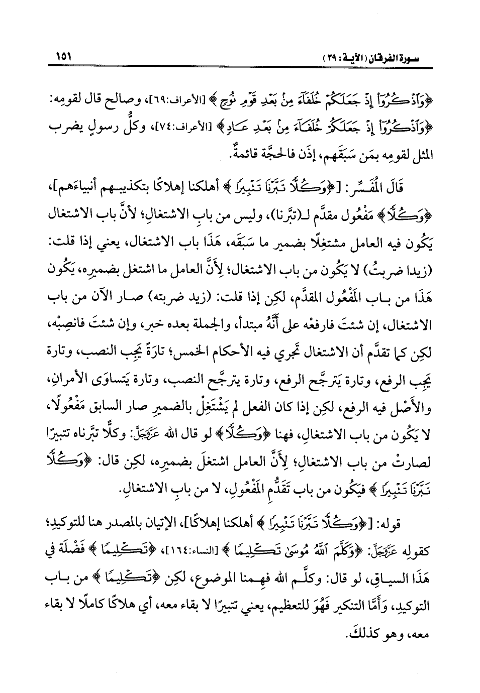 قَالَ المُفَسِّر: [{وَكُلًّا تَبَّرْنَا تَتْبِيرًا} أهلكنا إهلاكًا بتكذيبهم أنبياءَهم]، {وَكُلًّا} مَفْعُول مقدَّم لـ (تبَّرنا)، وليس من بابِ الاشتغالِ؛ لأنَّ باب الاشتغال يَكُون فيه العامل مشتغِلًا بضمير ما سَبَقَه، هَذَا باب الاشتغال، يعني إذا قلت: (زيدا ضربتُ) لا يَكُون من باب الاشتغال؛ لِأَنَّ العامل ما اشتغل بضميرِه، يَكُون هَذَا من باب المَفْعُول المقدَّم، لكِن إذا قلت: (زيد ضربته) صار الآن من باب الاشتغال، إن شئتَ فارفعْه على أَنَّهُ مبتدأ، والجملة بعده خبر، وإن شئتَ فانصِبْه، لكِن كما تقدَّم أن الاشتغال تَجري فيه الأحكام الخمس؛ تارَةً يَجِب النصب، وتارة يَجِب الرفع، وتارة يَترجَّح الرفع، وتارة يترجَّح النصب، وتارة يَتساوَى الأمرانِ، والأَصْل فيه الرفع، لكِن إذا كان الفعل لم يَشْتَغِلْ بالضميرِ صار السابق مَفْعُولًا، لا يَكُون من باب الاشتغالِ، فهنا {وَكُلًّا} لو قال اللَّه عَزَّ وَجَلَّ: وكلًّا تبَّرناه تتبيرًا لصارتْ من باب الاشتغالِ؛ لِأَنَّ العامل اشتغلَ بضميرِه، لكِن قال: {وَكُلًّا تَبَّرْنَا تَتْبِيرًا} فيَكُون من باب تَقَدُّمِ المَفْعُولِ، لا من بابِ الاشتغالِ.
