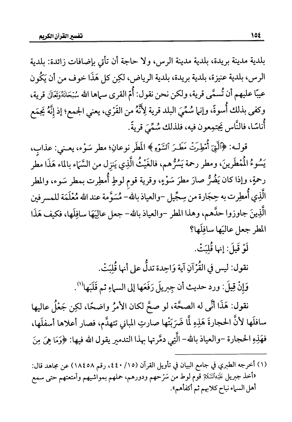 قوله: {الَّتِي أُمْطِرَتْ مَطَرَ السَّوْءِ} المَطَر نوعانِ؛ مطر سَوْء، يعني: عذابٍ، يَسُوءُ المُمْطَرينَ، ومطر رحمة يَسُرُّهم، فالغَيْثُ الَّذِي يَنزِل من السَّمَاء بالماء هَذَا مطر رحمةٍ، وإذا كان يَضُرُّ صارَ مطرَ سَوْءٍ، وقرية قومِ لوطٍ أُمطِرت بمطر سَوء، والمطر الَّذِي أُمطِرت به حِجَارة من سِجِّيل -والعياذ باللَّه- مُسَوَّمة عند اللَّه مُعْلَمَة للمسرفين الَّذِينَ جاوزوا حدَّهم، وهذا المطر -والعياذ باللَّهِ- جعل عالِيَهَا سافِلَها، فكيف هَذَا المطر جعل عاليَها سافِلَها؟