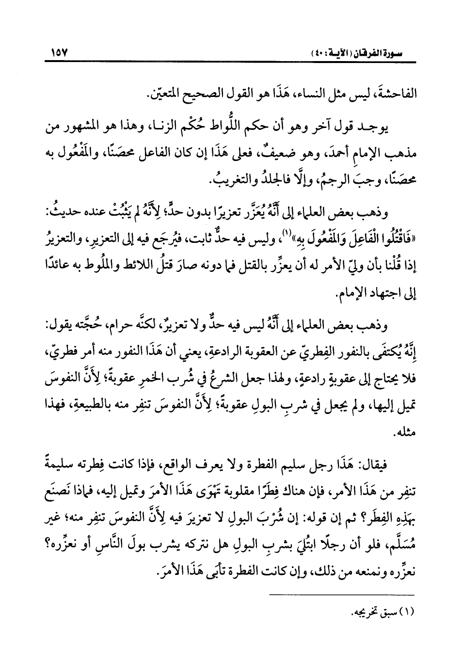 فيقال: هَذَا رجل سليم الفطرة ولا يعرف الواقع، فإذا كانت فِطرته سليمةً تنفِر من هَذَا الأمر، فإن هناك فِطَرًا مقلوبة تَهْوَى هَذَا الأمرَ وتميل إليه، فماذا نَصنَع بهَذه الفِطَر؟ ثم إن قوله: إن شُرْبَ البولِ لا تعزيرَ فيه لِأَنَّ النفوسَ تنفِر منه؛ غير مُسَلَّم، فلو أن رجلًا ابتليَ بشربِ البولِ هل نتركه يشرب بولَ النَّاسِ أو نعزِّره؟ نعزِّره ونمنعه من ذلك، وإن كانت الفطرة تأبَى هَذَا الأمرَ.