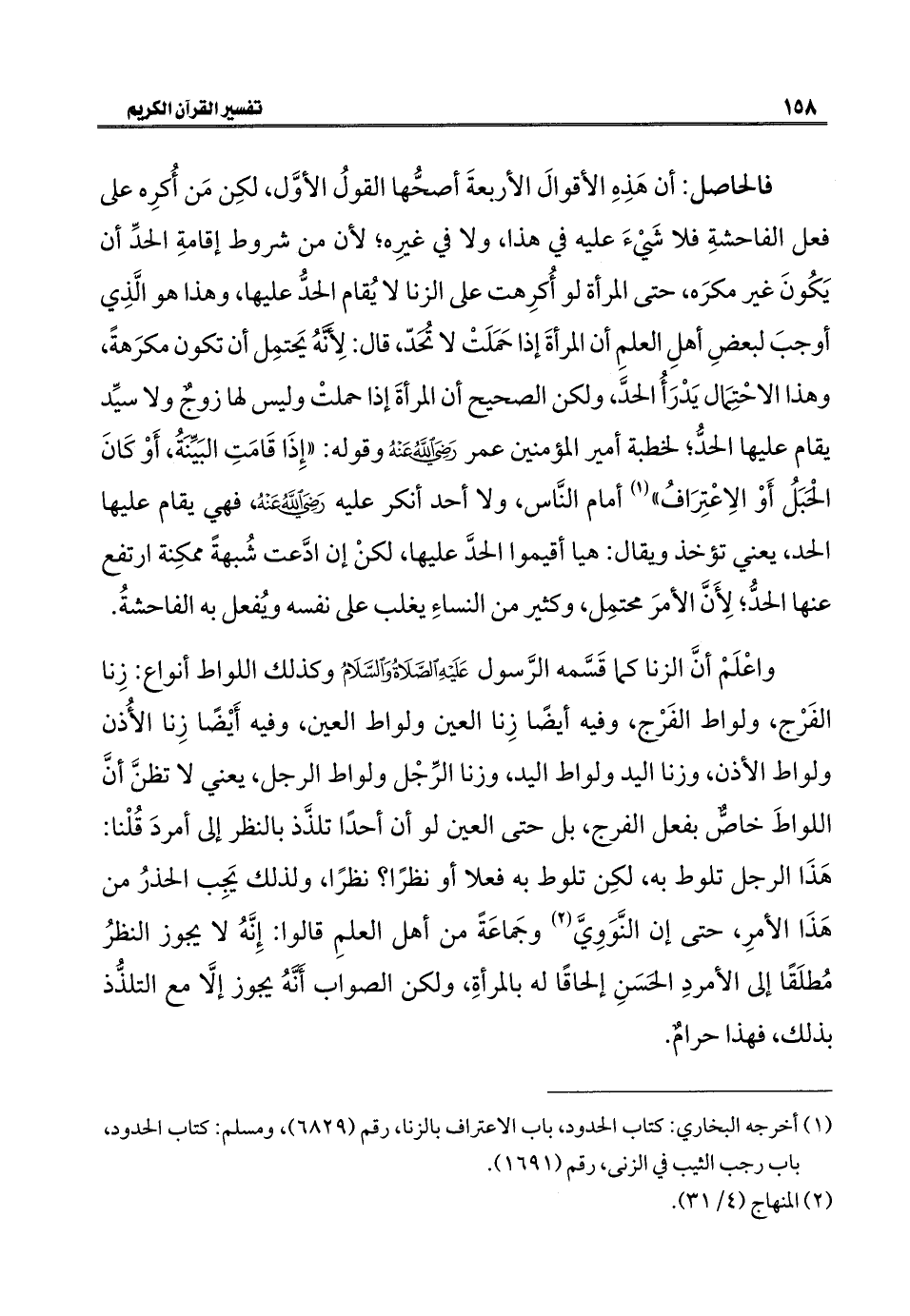 فالحاصل: أن هَذِهِ الأقوالَ الأربعةَ أصحُّها القولُ الأوَّل، لكِن مَن أُكرِه على فعل الفاحشةِ فلا شَيْءَ عليه في هذا, ولا في غيرِه؛ لأن من شروط إقامةِ الحدِّ أن يَكُونَ غير مكرَه، حتى المرأة لو أُكرِهت على الزنا لا يُقام الحدُّ عليها، وهذا هو الَّذِي أوجبَ لبعضِ أهلِ العلمِ أن المرأةَ إذا حَمَلَتْ لا تُحَدّ، قال: لِأنَّهُ يَحتمِل أن تكون مكرَهةً، وهذا الاحْتِمَال يَدْرَأُ الحدَّ، ولكن الصحيح أن المرأةَ إذا حملتْ وليس لها زوجٌ ولا سيِّد يقام عليها الحدُّ؛ لخطبة أمير المؤمنين عمر -رضي اللَّه عنه- وقوله: "إِذَا قَامَتِ البَيِّنَةُ، أَوْ كَانَ الحْبَلُ أَوْ الِاعْتِرَافُ" (¬١) أمام النَّاس، ولا أحد أنكر عليه -رضي اللَّه عنه-، فهي يقام عليها الحد، يعني تؤخذ ويقال: هيا أقيموا الحدَّ عليها, لكنْ إن ادَّعت شُبهةً ممكِنة ارتفع عنها الحدُّ؛ لِأَنَّ الأمرَ محتمِل، وكثير من النساءِ يغلب على نفسه ويُفعل به الفاحشةُ.