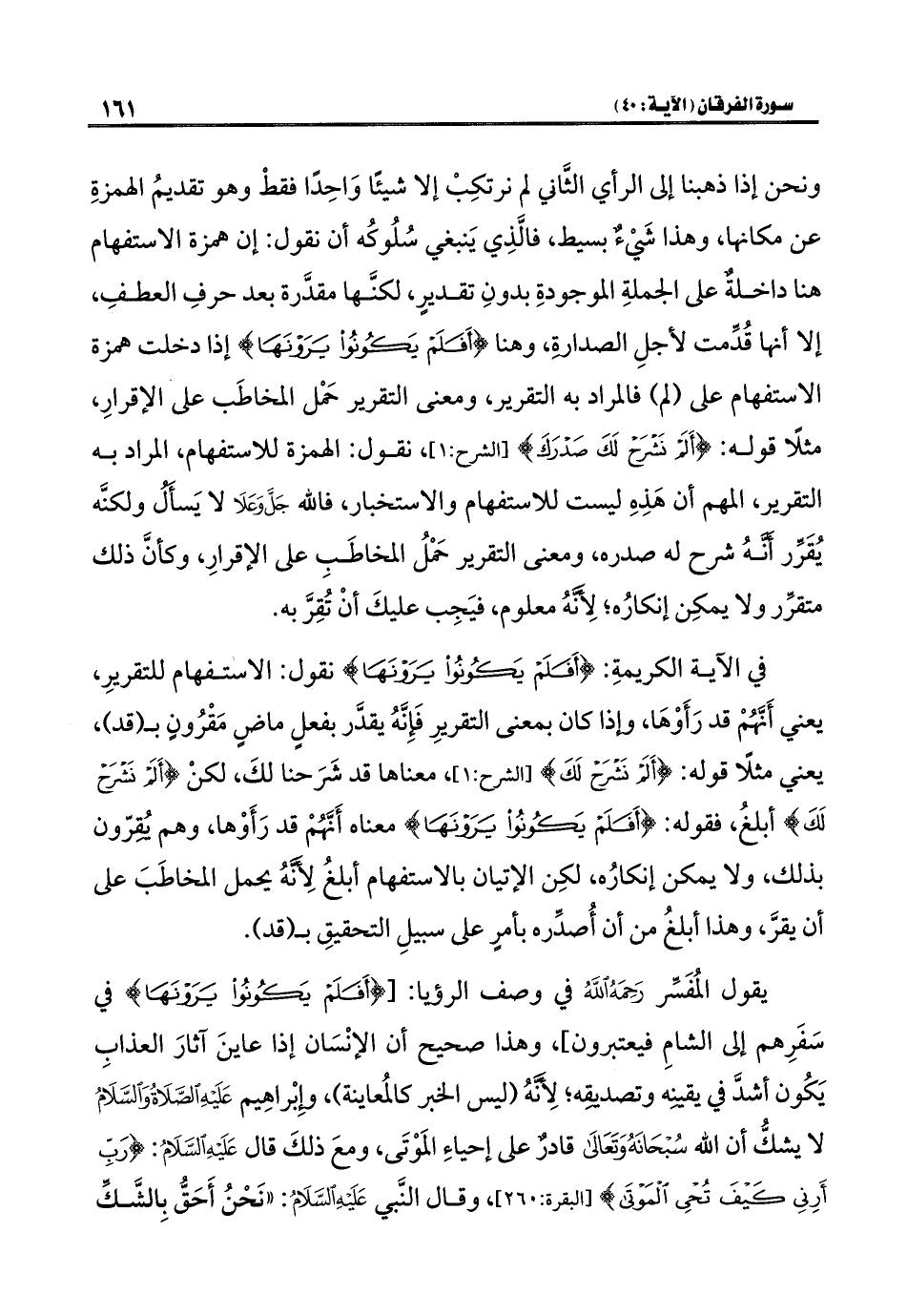 ونحن إذا ذهبنا إلى الرأي الثَّاني لم نرتكِبْ إلا شيئًا وَاحِدًا فقطْ وهو تقديمُ الهمزةِ عن مكانها، وهذا شَيْءٌ بسيط، فالَّذِي يَنبغي سُلُوكُه أن نقول: إن همزة الاستفهام هنا داخلةٌ على الجملةِ الموجودةِ بدونِ تقديرٍ، لكنَّها مقدَّرة بعد حرفِ العطفِ، إلا أنها قُدِّمت لأجلِ الصدارةِ، وهنا {أَفَلَمْ يَكُونُوا يَرَوْنَهَا} إذا دخلت همزة الاستفهام على (لم) فالمراد به التقرير، ومعنى التقرير حَمْل المخاطَب على الإقرارِ، مثلًا قوله: {أَلَمْ نَشْرَحْ لَكَ صَدْرَكَ} [الشرح: ١]، نقول: الهمزة للاستفهام، المراد به التقرير، المهم أن هَذِهِ ليست للاستفهام والاستخبار، فاللَّه جَلَّ وَعَلَا لا يَسأَلُ ولكنَّه يُقَرِّر أَنَّهُ شرح له صدره، ومعنى التقرير حَمْلُ المخاطَبِ على الإقرارِ، وكأنَّ ذلك متقرِّر ولا يمكِن إنكارُه؛ لِأَنَّهُ معلوم، فيَجِب عليكَ أنْ تُقِرَّ به.