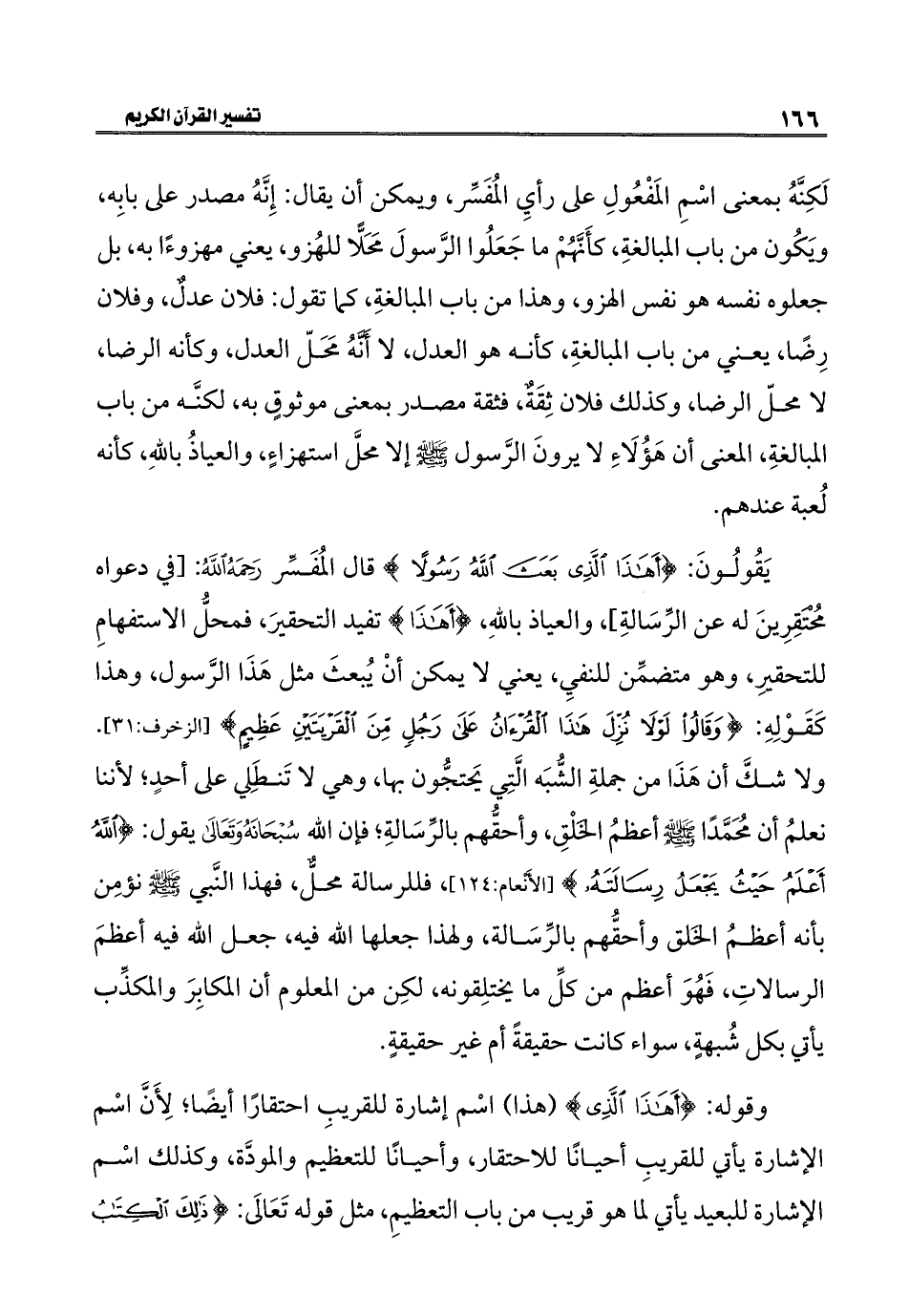 يَقُولُونَ: {أَهَذَا الَّذِي بَعَثَ اللَّهُ رَسُولًا} قال المُفَسِّر رَحِمَهُ اللَّهُ: [في دعواه محُتقِرِينَ له عن الرِّسَالةِ]، والعياذ باللَّهِ، {أَهَذَا} هو تفيد التحقيرَ، فمحلُّ الاستفهامِ للتحقيرِ، وهو متضمِّن للنفيِ، يعني لا يمكن أنْ يُبعثَ مثل هَذَا الرَّسول، وهذا كَقَوْلِهِ: {وَقَالُوا لَوْلَا نُزِّلَ هَذَا الْقُرْآنُ عَلَى رَجُلٍ مِنَ الْقَرْيَتَيْنِ عَظِيمٍ} [الزخرف: ٣١]. ولا شكَّ أن هَذَا من جملةِ الشُّبَه الَّتِي يَحتجُّون بها، وهي لا تَنطَلي على أحدٍ؛ لأننا نعلمُ أن مُحَمَّدًا -صلى اللَّه عليه وسلم- أعظمُ الخَلْقِ، وأحقُّهم بالرِّسَالةِ، فإن اللَّه سُبْحَانَهُ وَتَعَالَى يقول: {اللَّهُ أَعْلَمُ حَيْثُ يَجْعَلُ رِسَالَتَهُ} [الأنعام: ١٢٤]، فللرسالة محلُّ، فهذا النَّبي -صلى اللَّه عليه وسلم- نؤمِن بأنه أعظمُ الخَلق وأحقُّهم بالرِّسَالة، ولهذا جعلها اللَّه فيه، جعل اللَّه فيه أعظمَ الرسالاتِ، فَهُوَ أعظم من كلِّ ما يختلِقونه، لكِن من المعلوم أن المكابِرَ والمكذِّب يأتي بكل شُبهةٍ، سواء كانت حقيقةً أم غير حقيقةٍ.