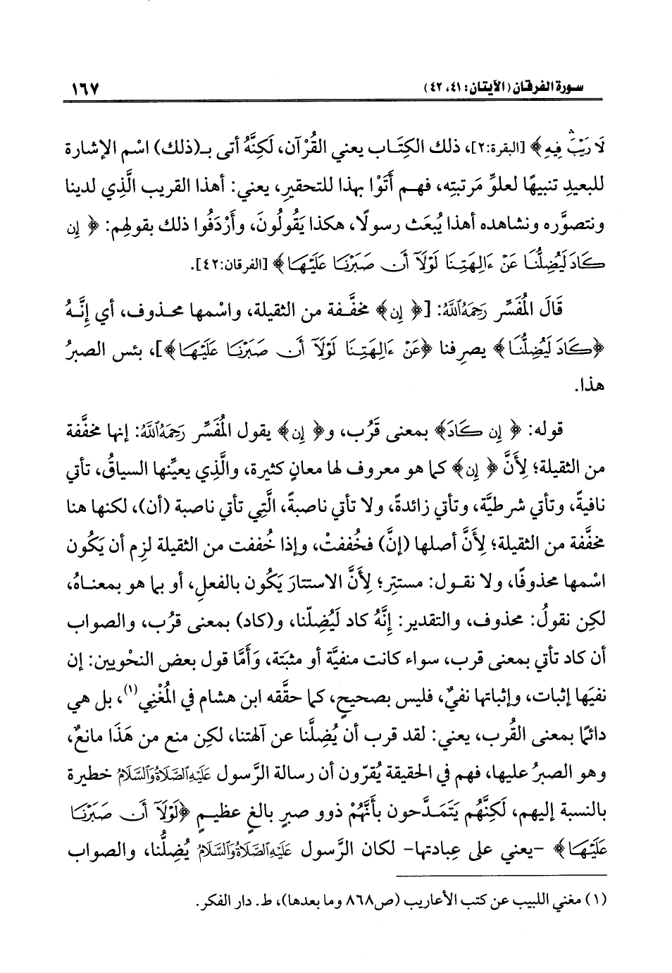 قوله: {إِنْ كَادَ} بمعنى قَرُب، و {إِن} يقول المُفَسِّر رَحِمَهُ اللَّهُ: إنها مخفَّفة من الثقيلة؛ لِأَنَّ {إِن} كما هو معروف لها معانٍ كثيرة، والَّذِي يعيِّنها السياقُ، تأتي نافيةً، وتأتي شرطيَّة، وتأتي زائدةً، ولا تأتي ناصبةً، الَّتِي تأتي ناصبة (أن)، لكنها هنا مخفَّفة من الثقيلة؛ لِأَنَّ أصلها (إنَّ) فخُففتْ، وإذا خُففت من الثقيلة لزِم أن يَكُون اسْمها محذوفًا، ولا نقول: مستتِر؛ لِأَنَّ الاستتارَ يَكُون بالفعلِ، أو بما هو بمعناهُ، لكِن نقولُ: محذوف، والتقدير: إِنَّهُ كاد لَيُضِلّنا، و (كاد) بمعنى قرُب، والصواب أن كاد تأتي بمعنى قرب، سواء كانت منفيَّة أو مثبَتة، وَأَمَّا قول بعض النحْويين: إن نفيَها إثبات، وإثباتها نفيٌ، فليس بصحيحٍ، كما حقَّقه ابن هشام في المُغْنِي (¬١)، بل هي دائمًا بمعنى القُرب، يعني: لقد قرب أن يُضِلَّنا عن آلهتنا، لكِن منع من هَذَا مانعٌ، وهو الصبرُ عليها، فهم في الحقيقة يُقرّون أن رسالة الرَّسول عَلَيْهِ الصَّلَاةُ وَالسَّلَامُ خطيرة بالنسبة إليهم، لَكِنَّهُم يَتَمَدَّحون بأَنَّهُمْ ذوو صبرٍ بالغٍ عظيمٍ {لَوْلَا أَنْ صَبَرْنَا عَلَيْهَا} -يعني على عِبادتها- لكان الرَّسول عَلَيْهِ الصَّلَاةُ وَالسَّلَامُ يُضِلُّنا، والصواب