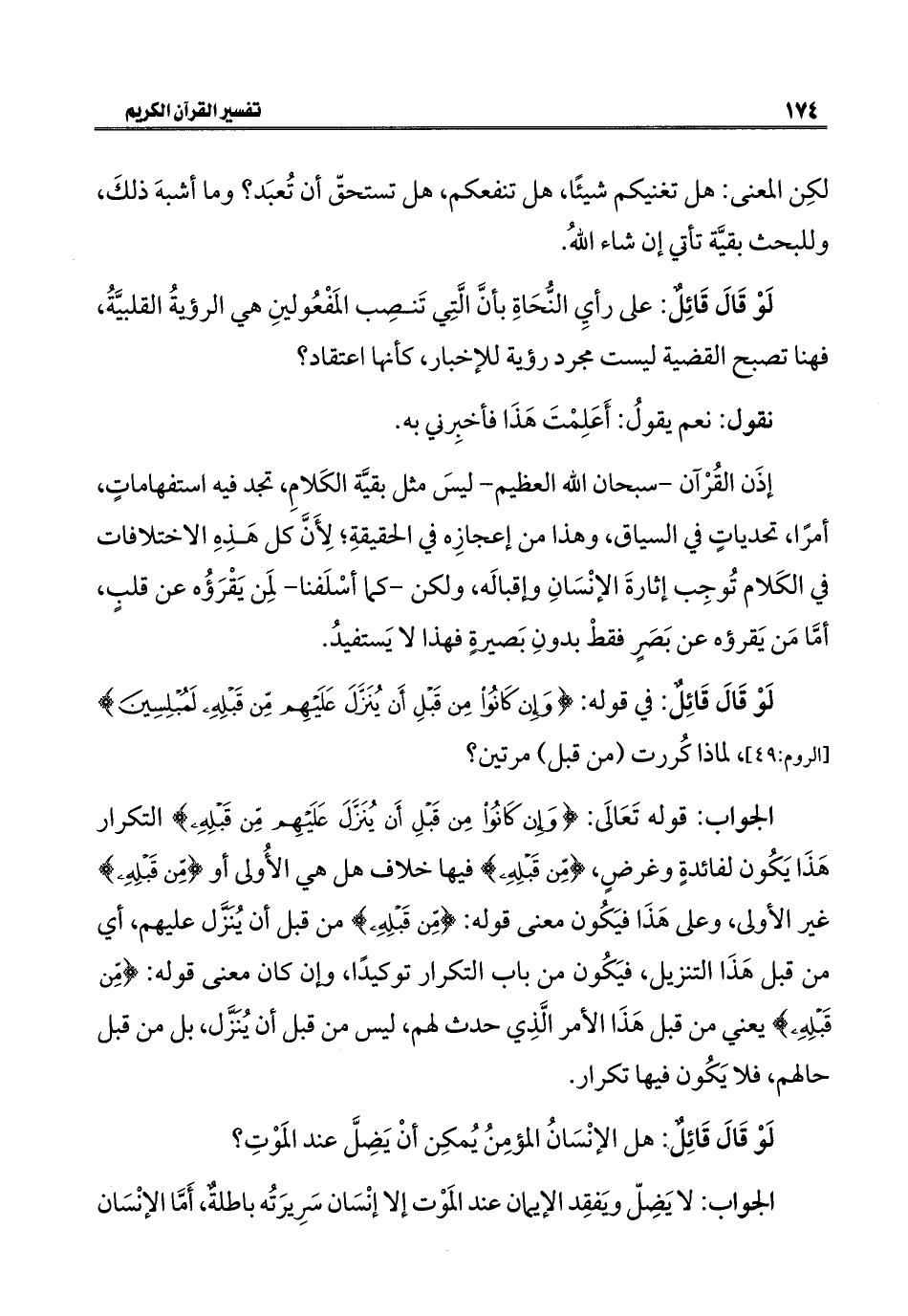 الجواب: قوله تَعَالَى: {وَإِنْ كَانُوا مِنْ قَبْلِ أَنْ يُنَزَّلَ عَلَيْهِمْ مِنْ قَبْلِهِ} التكرار هَذَا يَكُون لفائدةٍ وغرضٍ، {مِنْ قَبْلِهِ} فيها خلاف هل هي الأُولى أوله {مِنْ قَبْلِهِ} غير الأولى، وعلى هَذَا فيَكُون معنى قوله: {مِنْ قَبْلِهِ} من قبل أن يُنزَّل عليهم، أي من قبل هَذَا التنزيل، فيَكُون من باب التكرار توكيدًا، وإن كان معنى قوله: {مِنْ قَبْلِهِ} يعني من قبل هَذَا الأمر الَّذِي حدث لهم، ليس من قبل أن يُنزَّل، بل من قبل حالهم، فلا يَكُون فيها تكرار.