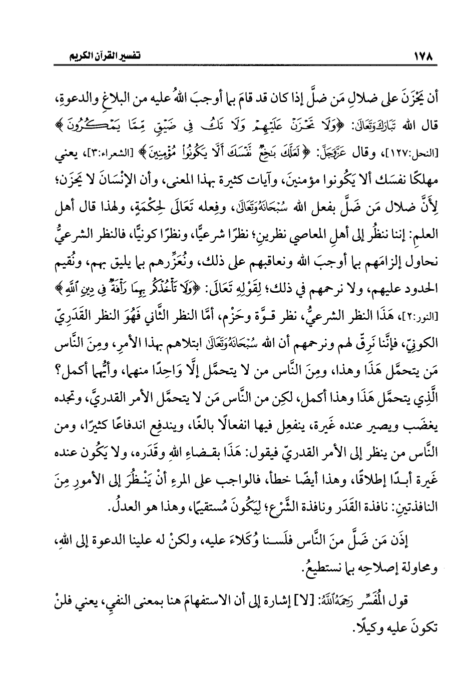 أن يَحْزَنَ على ضلالِ مَن ضلَّ إذا كان قد قامَ بما أوجبَ اللَّهُ عليه من البلاغِ والدعوةِ، قال اللَّه تَبَارَكَ وَتَعَالَى: {وَلَا تَحْزَنْ عَلَيْهِمْ وَلَا تَكُ فِي ضَيْقٍ مِمَّا يَمْكُرُونَ} [النحل: ١٢٧]، وقال عَزَّ وَجَلَّ: {لَعَلَّكَ بَاخِعٌ نَفْسَكَ أَلَّا يَكُونُوا مُؤْمِنِينَ} [الشعراء: ٣]، يعني مهلكًا نفسَك ألا يَكُونوا مؤمنينَ، وآيات كثيرة بهذا المعنى، وأن الإنْسَانَ لا يَحزَن؛ لِأَنَّ ضلال مَن ضَلَّ بفعل اللَّه سُبْحَانَهُ وَتَعَالَى، وفِعله تَعَالَى لحِكْمَةٍ، ولهذا قال أهل العلمِ: إننا ننظُر إلى أهلِ المعاصي نظرينِ؛ نظرًا شرعيًّا، ونظرًا كونيًّا، فالنظر الشرعيُّ نحاول إلزامَهم بما أوجبَ اللَّه ونعاقبهم على ذلك، ونُعَزِّرهم بما يليق بهم، ونُقيم الحدود عليهم، ولا نرحمهم في ذلك؛ لِقَوْلِهِ تَعَالَى: {وَلَا تَأْخُذْكُمْ بِهِمَا رَأْفَةٌ فِي دِينِ اللَّهِ} [النور: ٢]، هَذَا النظر الشرعيُّ، نظر قوَّة وحَزْم، أمَّا النظر الثَّاني فَهُوَ النظر القَدَرِيّ الكونِّي، فإنَّنا نَرِقّ لهم ونرحمهم أن اللَّه سُبْحَانَهُ وَتَعَالَى ابتلاهم بهذا الأمرِ، ومنَ النَّاس مَن يتحمَّل هَذَا وهذا، ومِنَ النَّاس من لا يتحمَّل إلَّا وَاحِدًا منهما، وأيُّهما أكمل؟ الَّذِي يتحمَّل هَذَا وهذا أكمل، لكِن من النَّاس مَن لا يتحمَّل الأمر القدريَّ، وتجده يغضَب ويصير عنده غَيرة، ينفعِل فيها انفعالًا بالغًا، ويندفِع اندفاعًا كثيرًا، ومن النَّاس من ينظر إلى الأمر القدريّ فيقول: هَذَا بقضاءِ اللَّهِ وقَدَره، ولا يَكُون عنده غَيرة أبدًا إطلاقًا، وهذا أيضًا خطأ، فالواجب على المرءِ أنْ يَنْظُرَ إلى الأمورِ مِنَ النافذتينِ: نافذة القَدَر ونافذة الشَّرْع؛ ليَكُونَ مُستقيمًا، وهذا هو العدلُ.