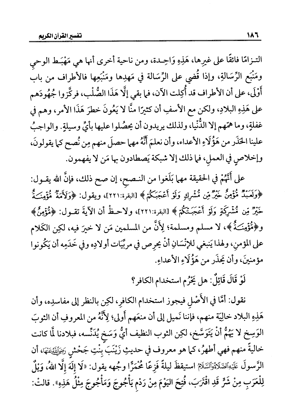 على أَنَّهُمْ في الحقيقة مهما بَلَغوا من النصحِ، إن صح ذلك، فإنَّ اللَّه يقول: {وَلَعَبْدٌ مُؤْمِنٌ خَيْرٌ مِنْ مُشْرِكٍ وَلَوْ أَعْجَبَكُمْ} [البقرة: ٢٢١]، ويقول: {وَلَأَمَةٌ مُؤْمِنَةٌ خَيْرٌ مِنْ مُشْرِكَةٍ وَلَوْ أَعْجَبَتْكُمْ} [البقرة: ٢٢١]، ولاحظْ أن الآيةَ تقول: {مُؤْمِنٌ} و {مُؤْمِنَةٌ}، لا مسلم ومسلمة؛ لِأَنَّ من المسلمين مَن لا خيرَ فيه، لكِن الكَلام على المؤمنِ، ولهذا يَنبغي للإنْسَانِ أنْ يحرِص في مربِّيَات أولادِه وفي خَدَمِه أن يَكُونوا مؤمنينَ، وأن يَحذَر من هَؤُلَاءِ الأعداءِ.