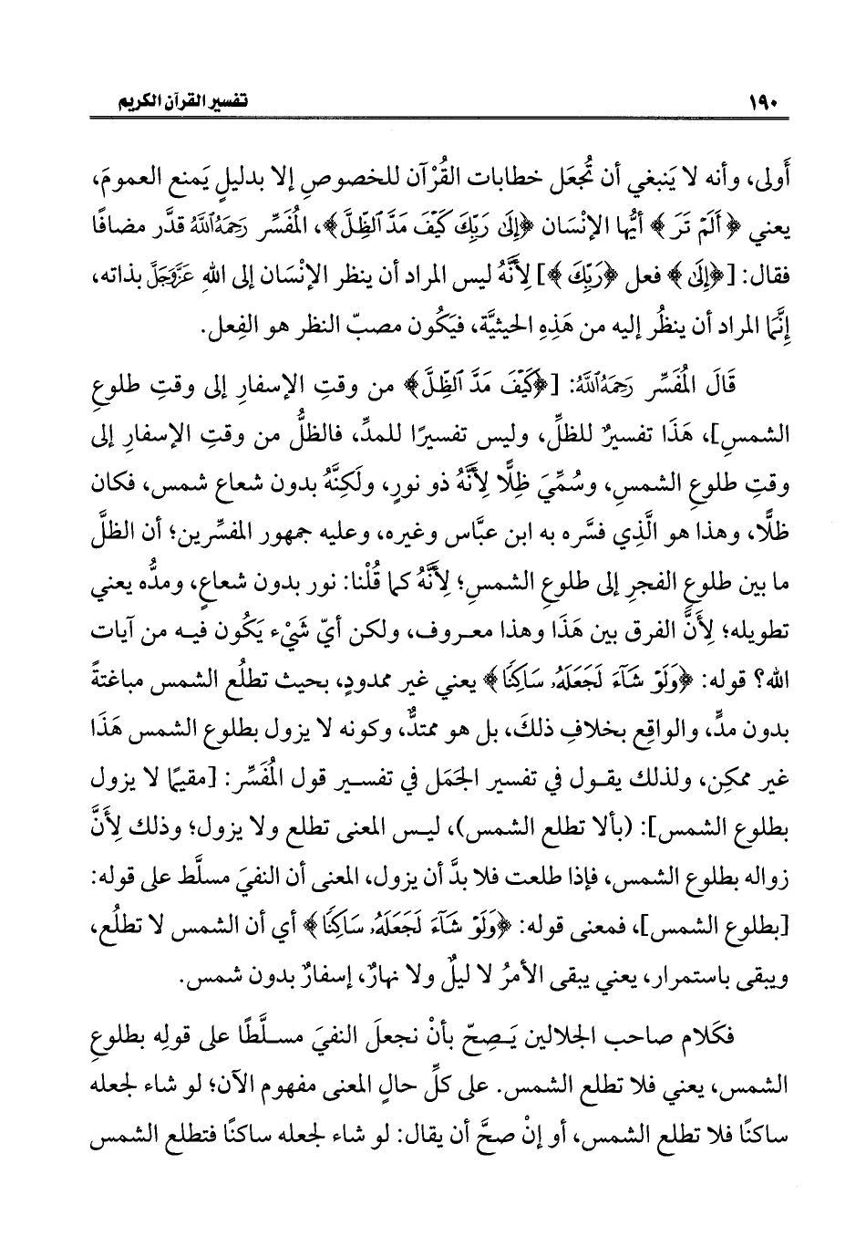 أَولى، وأنه لا يَنبغي أن تُجعَل خطابات القُرْآن للخصوصِ إلا بدليلٍ يَمنع العمومَ، يعني {أَلَمْ تَرَ} أيُّها الإنْسَان {كَيْفَ مَدَّ الظِّلَّ}، المُفَسِّر رَحِمَهُ اللَّهُ قدَّر مضافًا فقال: [{إِلَى} فعل {رَبِّكَ}] لِأنَّهُ ليس المراد أن ينظر الإنْسَان إلى اللَّهِ عَزَّ وَجَلَّ بذاته، إِنَّمَا المراد أن ينظُر إليه من هَذِهِ الحيثيَّة، فيَكُون مصبّ النظر هو الفِعل.